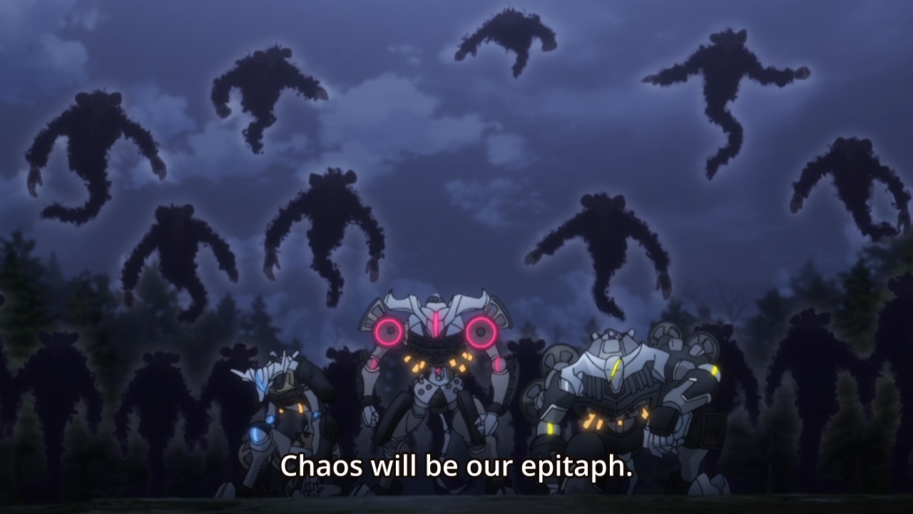 — Speaking of underdeveloped subplots, what did those sisters really want? I thought they wanted to destroy the world. I thought they knew what that would entail, i.e. their own demise. But now that they’ve been saved by Denka’s message of love, they’re going to turn a new leaf? Feels kinda rushed like everything else in this series.