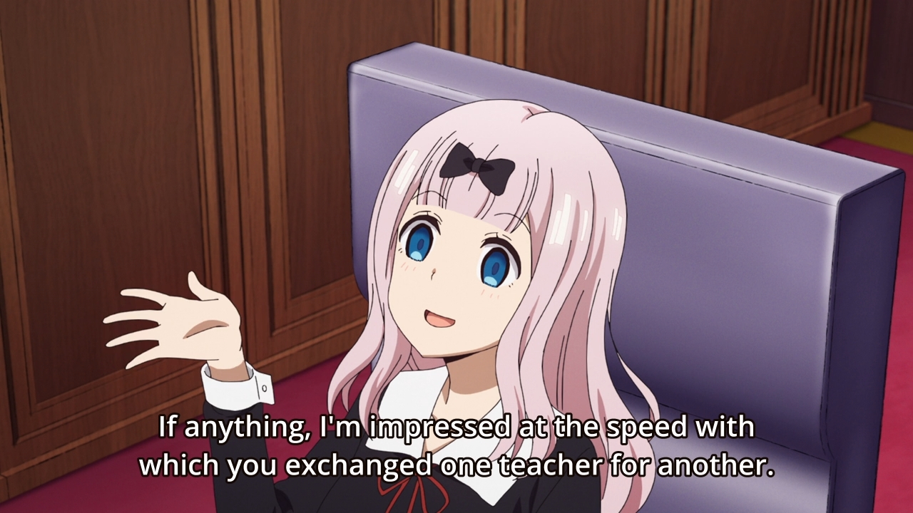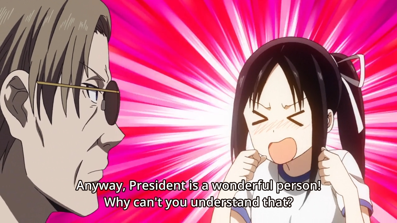 — Chika gets mad at the president’s incompetence as usual, so she initially storms off. This leaves the door open for Kaguya to step in as coach, but her intentions prove to be less than innocent.