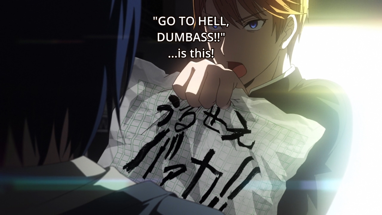 — Back in the present, Miyuki goes and picks Yu up. This time, his circumstances are completely different. He actually has people on his side (even though Miko did fight for him). And as cliche as it sounds, this is what friends are for. This would’ve been a sweet moment by itself. After all, not only did Miyuki recognize that his kouhai was in trouble, he went up to Yu in the middle of a rally just to reach out to him. He wasn’t remotely self-conscious about it. But then we get a flashback about how the student council had done extensive detective work to figure out the true story behind Yu beating up Kyoko’s boyfriend. And just like that, my suspension of disbelief is out the window.
