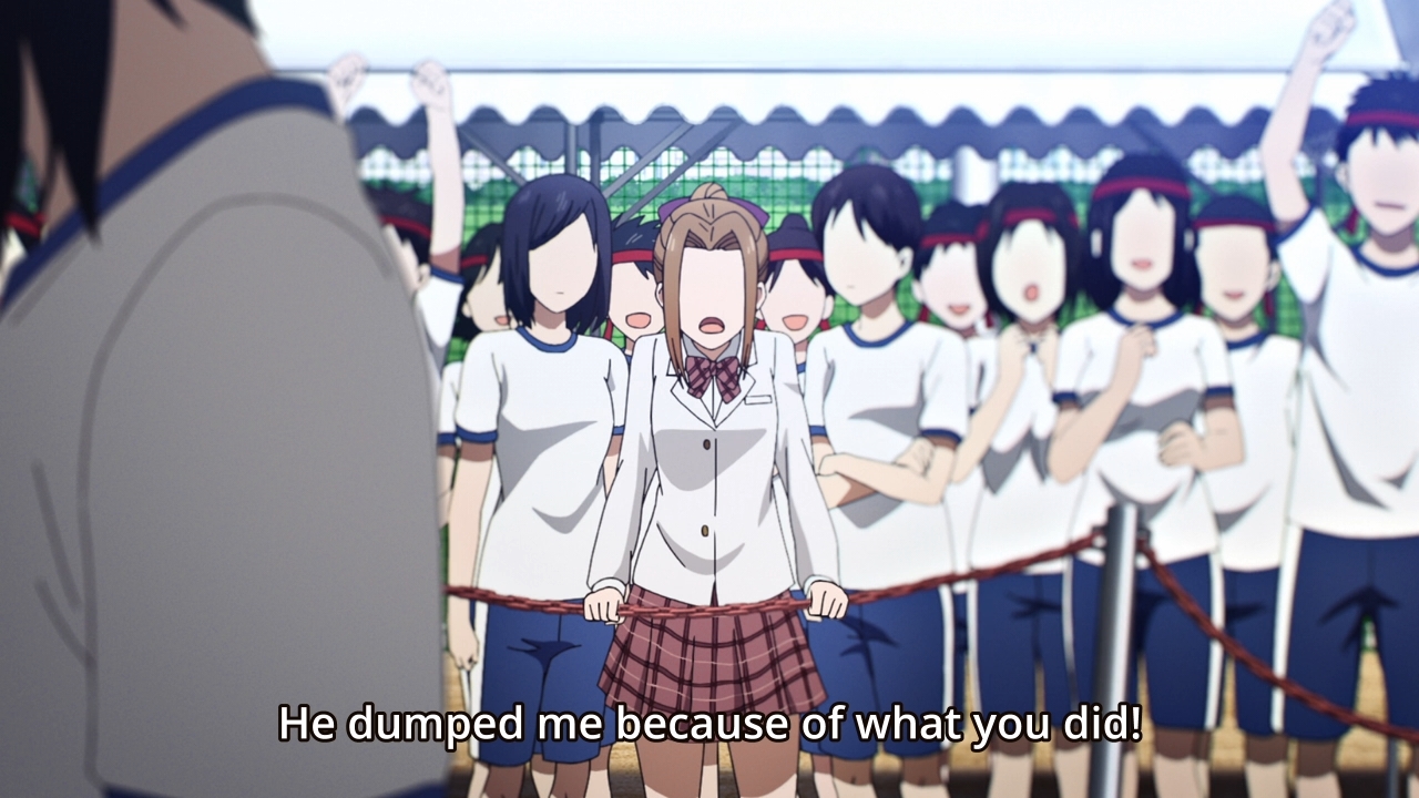 — As Yu readies himself for the relay race, Kyoko is heckling him from the sidelines. She’s honestly still hung up on her ex-boyfriend dumping her. Good lord, it was a fucking middle school relationship. Not even a high school relationship! A middle school relationship. How goddamn dumb is that? Was this kid Adonis at 13 or 14 years old? Did he piss out boba tea? Did his farts smell like strawberry crepes? Who on earth doesn’t get over their middle school boyfriend? That makes her even more pathetic than Yu.