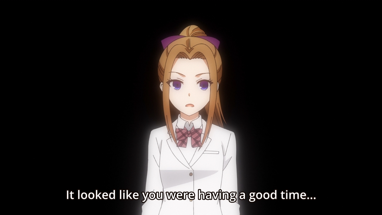 I thought it was a good episode, but they really butchered the final dialogue between Kaguya and Hayasaka. Essentially, Kaguya tells Hayasaka that while she herself didn’t do anything to Ogino (the cheating boyfriend), she did tell Ishigami’s story to “the right people” i.e. the school elites who could mess him up. Hayasaka is understandably horrified. Kaguya then briefly wonders what sort of face Kyoko would make if she told her the truth, with a really evil expression on her face. I thought it was hilarious and I was really miffed it ended up on the cutting room floor.