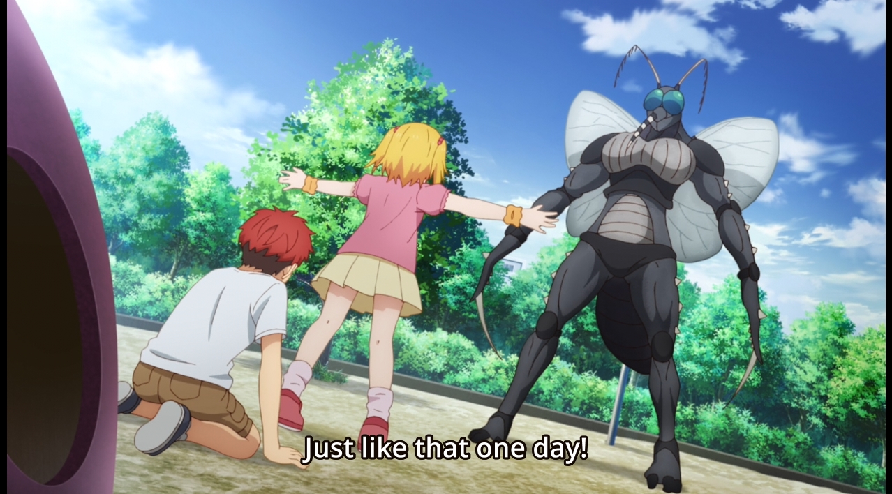 You know how Batman was forever shaped by seeing his parents killed before his very eyes? Well, Ret has also been shaped by his childhood friend turning frigid. Thanks to that fateful day, he’s become superhero who battles aliens. But whereas Batman has a suit, our hero completely loses his clothes whenever he has to fight evil. Ah well… them’s the breaks. This is the sort of occupational hazard that comes with starring in an ecchi comedy. Unfortunately, the alien he thought he defeated quickly comes back even stronger than ever. And this time, he’s all out of energy. It’s been a whole day, though. If a young man needs more time to get it up, maybe he should see a doctor. To make matters even worse, Kirara is with him this time. Unable to fight back, Ret grabs Kirara’s hand and leads her to a hiding place. They thus end up in the exact same playground from their past, ’cause y’know, a good story is like poetry; it rhymes.