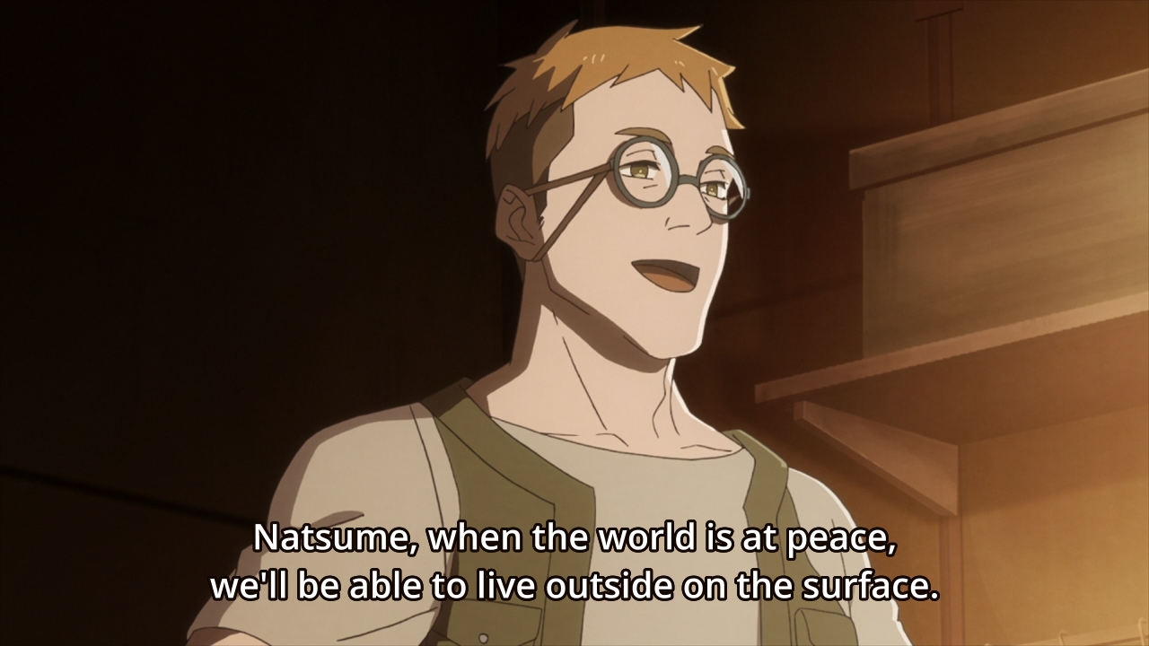 — After facing one doubter after another, Natsume goes and seeks advice from her idol Kurenai. Here, we see these two act as extensions of humanity itself. Kurenai fights because hiding within the mobile fortress makes her feel as though she isn’t alive. This then triggers a memory in Natsume. She starts remembering all those times her father told her about the real world. Essentially, they both dreamed of living on the surface one day. In other words, she can’t let her father’s dream die along with him. Finally, Natsume just wants to prove her doubters wrong. So yeah, all of these reasons pretty apply to humanity writ large. Kaburagi doesn’t want Natsume to die, so he tries to tell her that the struggle is futile. The conflict will go on forever, because it’s supposed to. He has already resigned himself to fate. But Natsume is the bug in the System, and part of being human is to struggle against one’s fate at all cost. Even if you achieve nothing, you will at least live the life that you wanted for yourself. So who knows? Maybe Kaburagi now needs to learn from Natsume and rage against the machines. Okay, okay, that was lame.