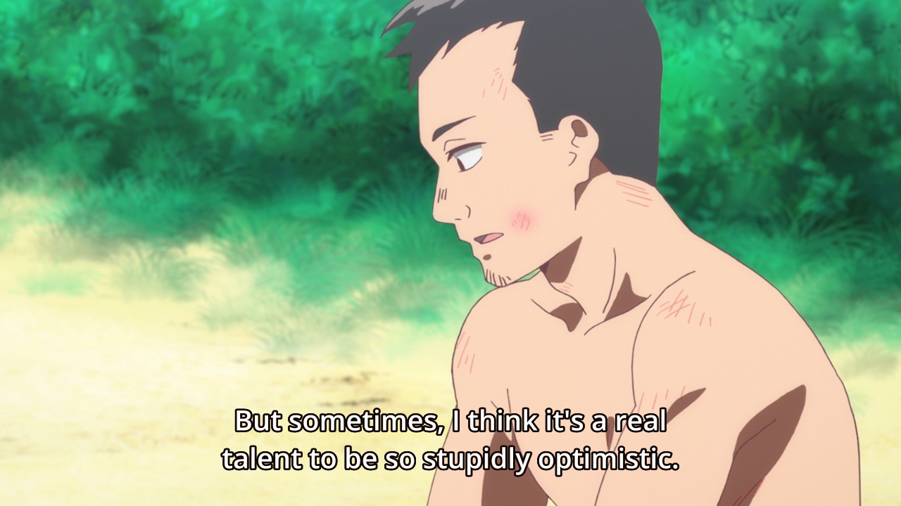 — Elsewhere, Kibe takes Chizuru aside and starts defending Kazuya. He starts going on and on about how his buddy’s optimism means that he’ll never give up. We get some backstory on how he kept watering a plant until it bloomed. In other words, he’ll keep going until he gets the best results. So if Chizuru just sticks it out, Kibe is sure that Kazuya will eventually make her happy. That’s nice and all, but people are obviously not plants. People can’t afford to sit around and wait for someone to get their shit together. Kazuya is an adult now. That doesn’t mean he can’t make mistakes or fuck up, but there’s a limit to this. Kazuya’s been fucking up since the first episode. Hell, probably since the day he could walk and talk.
