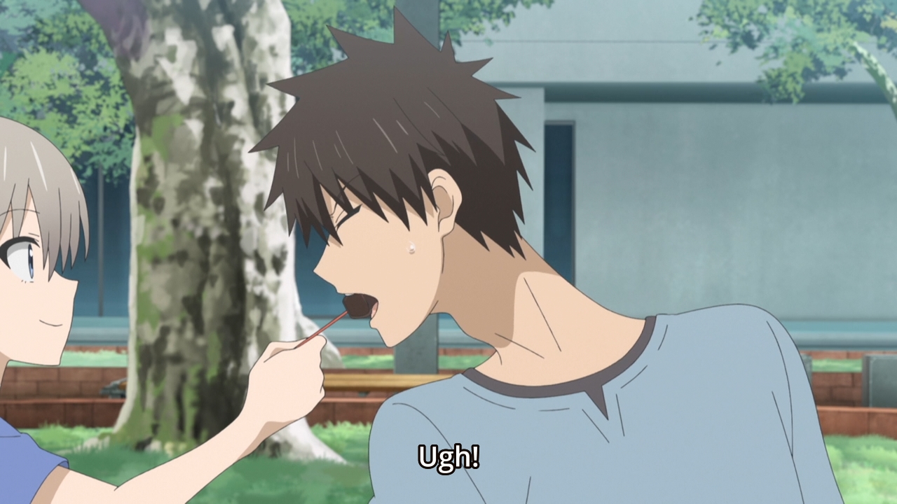 — This silly scene, however, is just one long setup for yet another “indirect kissu” moment in anime. Once again, Hana is wearing down Shinichi’s defenses. Without her, he would never consider even trying chocolate mints (apparently, there’s a childhood trauma behind this aversion), but now he has to… with her hand-feeding him. And when she goes for the last bite, she is suddenly not so oblivious anymore.