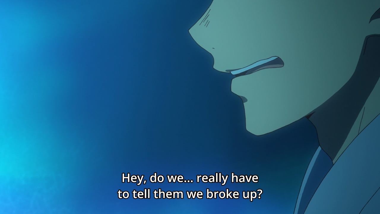 — Kazuya wants to tell his buddies that he and Chizuru are not breaking up, which is normal, I guess. But for some reason, she also needs to be there with him. It has to be done in person, which I find kinda hilarious. I don’t think I’ve ever told my friends in person that I was dating or dumping someone.