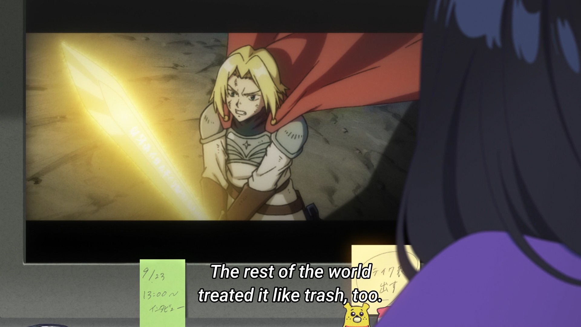 My biggest beef with the isekai genre is that I can’t relate. Even if you promise me the largest harem full of short-haired tomboys with abs, all the riches in the world, and powers to make everyone bend their knee, the first thing that would come to my mind is, “Fuck, what’s going to happen to my cat?” But isn’t that funny? Isn’t it strange how in all these isekai series, no one ever worries about their pets? Forget loved ones. They’ll be sad of course (I hope) — maybe even devastated — by your sudden, inexplicable disappearance, but they’ll likely live. They’ll pull through and continue on with their lives. What about the pets though? You mean to tell me isekai MCs don’t have pets? But this isn’t the only reason why the concept of isekai doesn’t appeal to me; it’s just the very first thing that comes to mind. What about my bills? What about the food that will spoil in my fridge? I’m totally fired when I can return to my own world. And if I’m going to a fantasy world, I don’t exactly want to shit in an outhouse or whatever. I’m also terminally online. Yes, yes, a fantasy world is new and exciting… to a certain point. Then what will I do with the rest of time? It’s not only about your loved ones or your all-too-dependent-on-you cats and dogs. It’s the logistics of it all, man. So when our heroine Natsuko finally has time to assess her situation, I was initially pleased to see that she wanted to go home. But it doesn’t really last all that long, does it? At some point, when there’s nothing you can do about a problem, you gotta roll with the punches. But I wish these characters would ruminate on their situation for a little longer. What about her deadlines? Doesn’t she have a movie to finish? Maybe time stops in the real world, but she doesn’t know that. We don’t know that either!