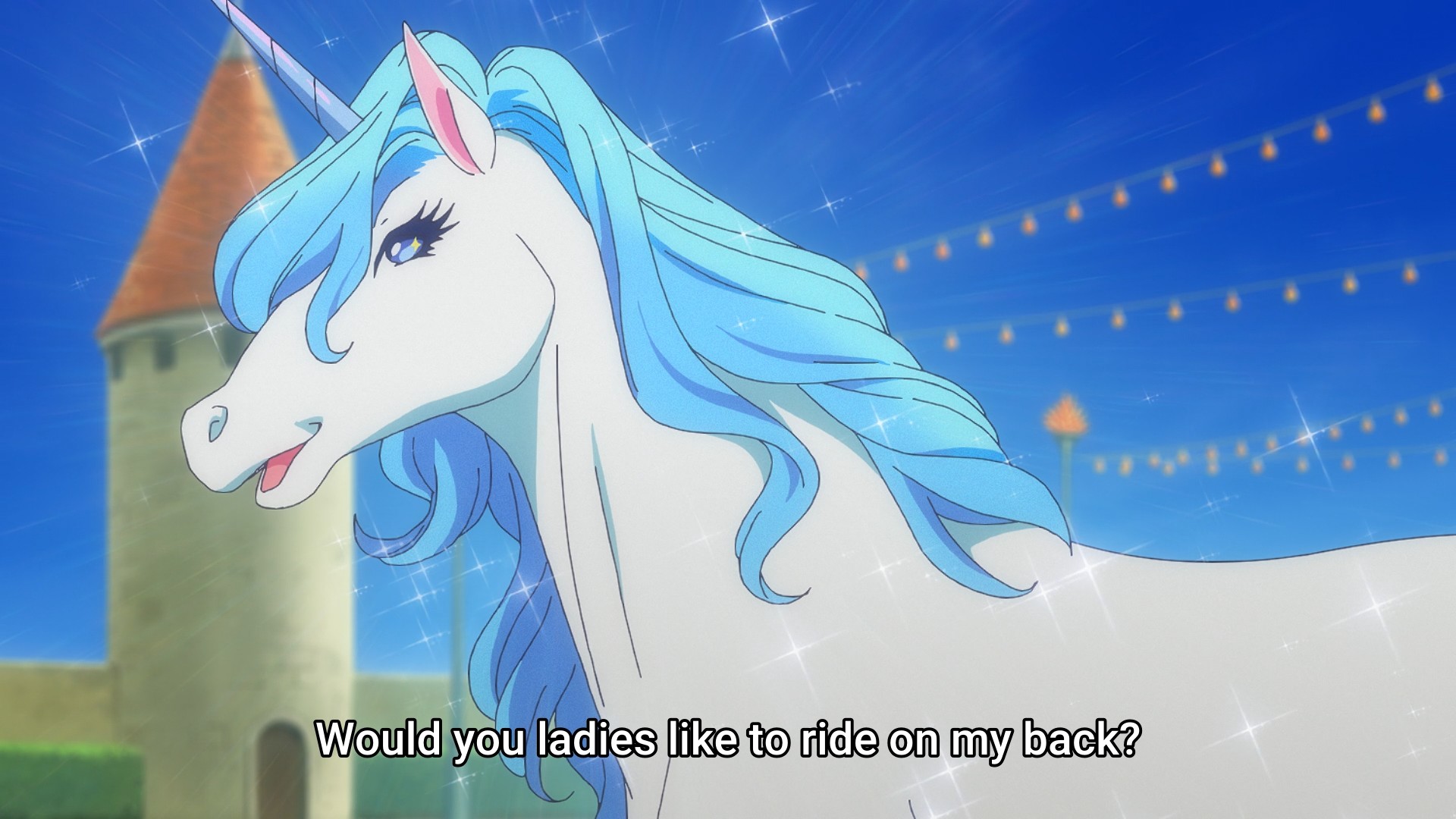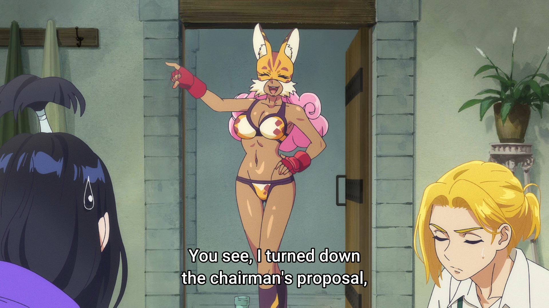 And maybe this is unfair of me, but so far — this whole setup with Natsuko’s favorite childhood anime, a talking unicorn, a rich girl turned masked wrestler, etc — it all feels like a game to me. And yeah, I suppose it’s not supposed to be all that serious. But if it ain’t all that serious, I’m not all that emotionally invested either. My mind drifts to Solo Leveling, where a guy goes from loser to chad who now drops liners in battle like, “Looks like it’s over… I said it’s over!” Wow, so cool. What an alpha, sigma, or whatever Greek alphabet I’m supposed to be nowadays. My point is that it was kinda interesting when this guy could barely make ends meet, but his mom is in the hospital slowly withering away and he’s got a little sister and her education to worry about. Now that those concerns are less… concerning, what are we going to do all day? Pose with your back to the audience and make quippy lines all day? Moreover, he survives, and the cute girls and the one token sappy dork survives, but everyone else dies. Everyone else who had a family (or a cat!) is fodder, so we can prove that the mobs are strong and thus our hero is even stronger by defeating them. And this brings me back to the serial killer thing above. There are people here. Tell me their story. How are they coping in this harsh, cruel world where a random gate can turn red (whatever that means)?