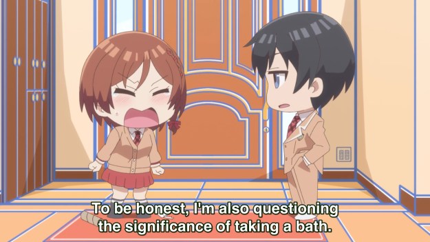 Like the title of the post implies, the premise is a lie. Of course, this is a romantic comedy of sorts, so I never expected Saito and Akane to hate each other’s guts from start to finish. They still bicker, but it’s clear almost immediately that they’re developing feelings; Saito admits that Akane is beautiful when she smiles (groan), and Akane is jealous if Saito is too nice to other girls. Conflicts arise from the growing pains of cohabitation. My perspective is skewed, because I’m used to the whole “date someone for a while, then live together for a while, then you finally marry if everything goes well” dealio. I would never consider an arranged marriage; I would never consider a relationship that isn’t born from love. My parents brought arranged marriages up once and I immediately shot it down. Nevertheless, arranged marriages are still a thing in a lot of cultures. And if you’re neck deep in those cultures, rather than fight it, you might as well learn to cope with it. That’s what we get over and over in a few of these episodes. Two very different people have to learn to compromise and cohabitate. Rather than “I’m Getting Married to a Girl I Hate in My Class,” it would have made more sense to call this show “I’m Getting Married to a Girl Who is a Massive Tsundere.” Actually, make it “A Massive Tsundere Has To Teach Me How Not to be a Complete Slob.”