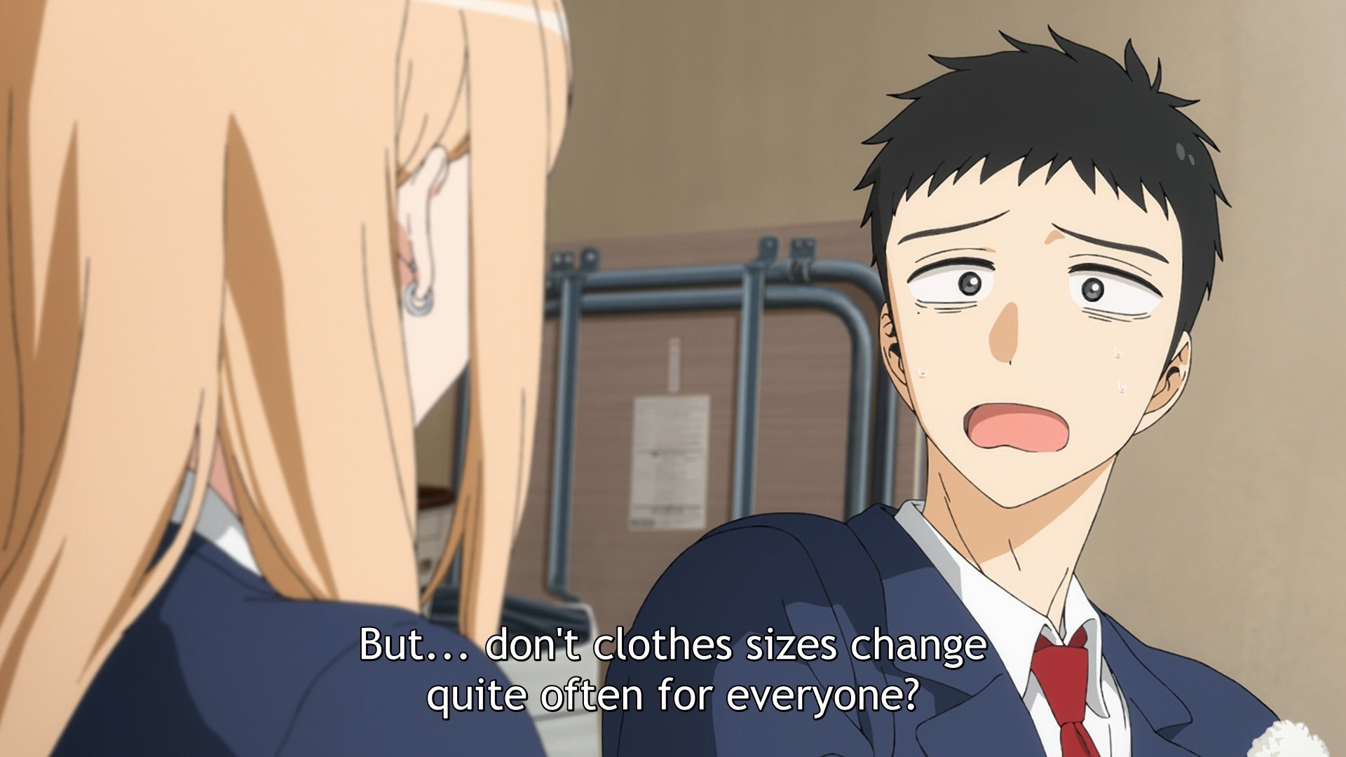 Can you really tell that Marin has gained weight? Apparently yes; multiple people point it out in this week’s episode. In fact, Nowa supposedly noticed it when Marin was cosplaying as Rei-sama during the cultural festival. Well, you coulda fooled me. But it’s anime, so it’s hard to tell unless they oversell it. Anime can show me two different characters, tell me that person A is way hotter than person B, and I’ll just be like “Hweh?” But I digress. Marin’s girlies actually speculate that the special undies required to give a person a masculine body shape probably hid the weight gain. But if that’s true, then how did Nowa notice anything? At the end of the day, ball don’t lie, and the “ball” in this case is Gojo’s bespoke costumes. They were specifically tailored to a snapshot of Marin’s body, and if they don’t fit, then they don’t fit. Can’t be in denial about that.