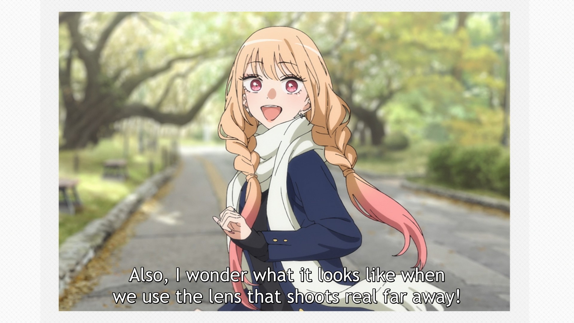 As I alluded to above, Marin eventually comes to the realization that Gojo has been spoiling her with food (not that she blames him), but even then, that’s not really true. The true culprit is actually her impulse control or lack thereof. Marin’s metabolism hasn’t suddenly crashed or anything, so the laws of thermodynamics must be obeyed, i.e. calories in, calories out. She only has herself to blame, because she can’t help herself from snacking on his leftovers even when she’s just had a big dinner. Her lack of impulse control isn’t limited to food either. Towards the end of the episode, Marin tells Gojo how she bought a certain camera model on a whim simply because it has the letter “M” in the name — “M” for Marin. That’s right, she bought a random DLSR camera that probably costs over a grand due to a letter.