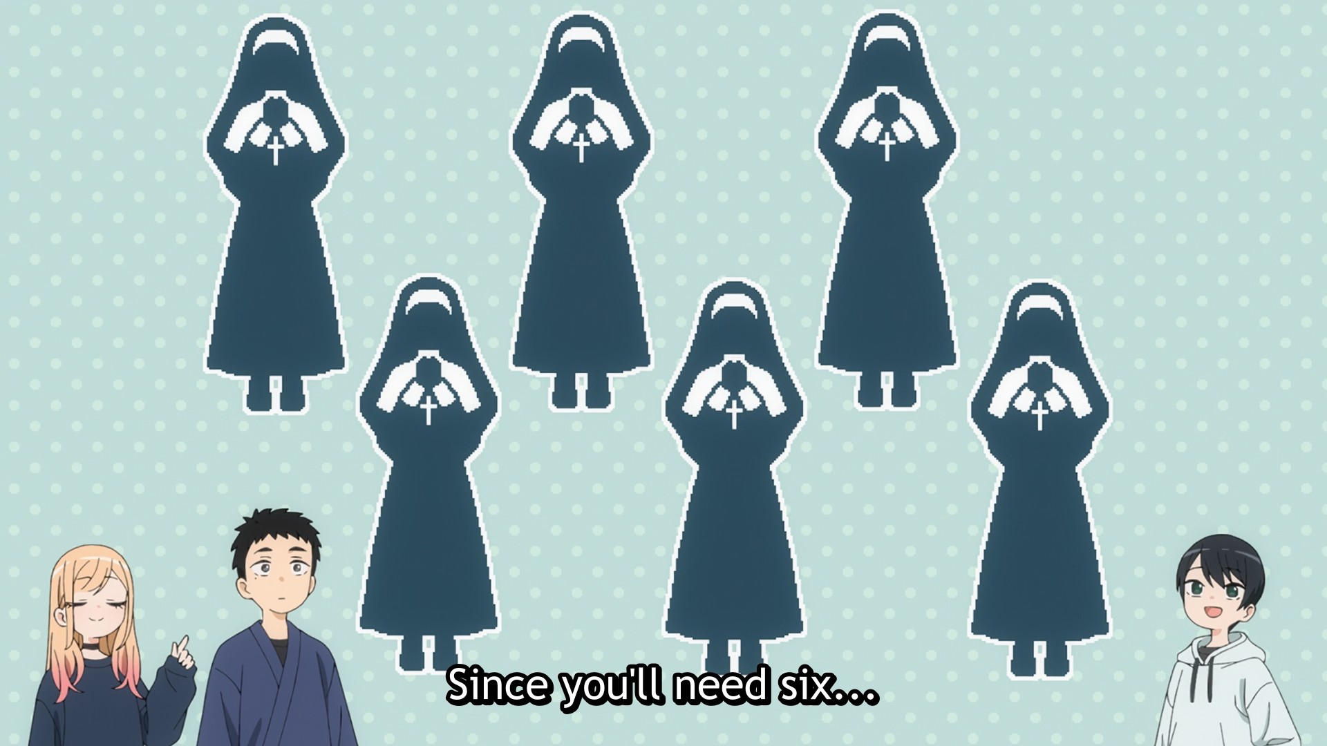 Oddly enough, Suzuka and Gojo have never met until this week’s episode. And somehow, Suzuka and Akira are good friends. Small world and all that. Finally, to top it all off, Akira starts acting strangely around Marin as soon as the groups converge. Talk about a group cosplay with nuns comes up, and one by one, everyone gets roped into it. When Amane invites Marin to join them, Akira’s friends give her the side-eye like they think it’ll be a big problem. Basically, the story is trying to be cute and trick you into thinking that maybe someone as reserved and mature like Akira might not vibe with our bold and boisterous gyaru. The show even has Akira exude purple, evil-looking aura. Knowing this anime, however, I highly doubt Akira harbors any negative thoughts towards Marin. She’s probably just nervous, because she’s a big fan or something. Classic stan behavior. So sure, I like the show, but it does get a bit predictable at time with how it continuously tries to subvert expectations that probably don’t exist in the first place.