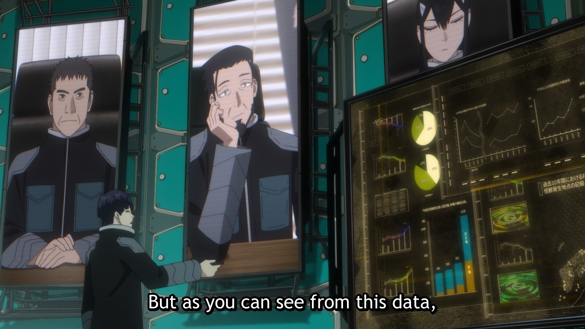 Right off the bat, we see Soshiro talking to a massive kaiju inside a tank that is filled to the brim with fluid, and yet, the kaiju’s voice is not distorted at all. That really bugs me.