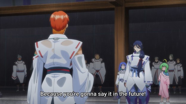 We learn in these pair of episodes that the pretty boy anime character with long hair might actually be the villain. Quelle surprise. Anyway, Takeru has been isekai’d to a world where they sacrifice the weak in order to sustain society’s ongoing existence or whatever. Like with New Saga, I like time traveling stories as a concept. Time looping ones or okay too. But these stories still hinge on the main character being worth a damn. I couldn’t get into Re:Zero simply because I didn’t like Subaru. And likewise, Takeru is too stupid for me to fully enjoy Onmyo Kaiten.
