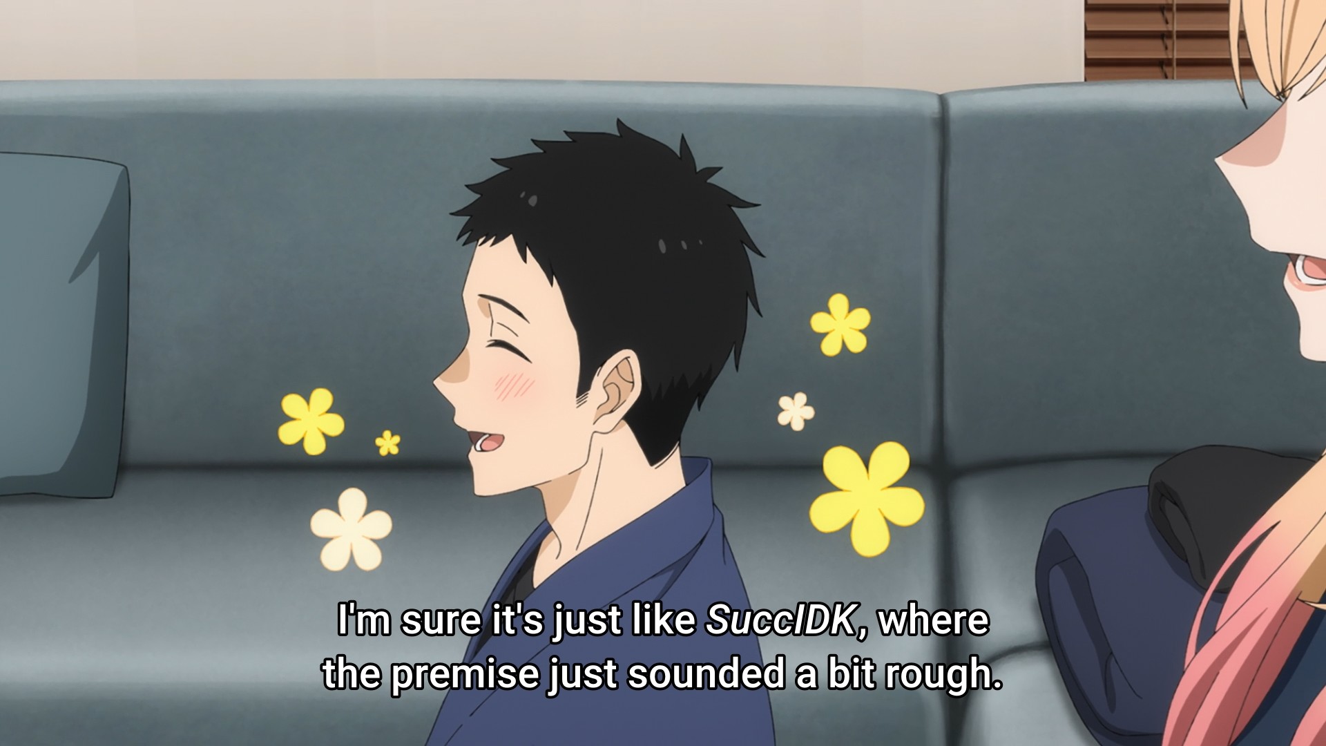 Like always, Gojo won’t do anything without thoroughly doing his research. Even though he won’t be designing any of the costumes for the upcoming group cosplay, he still wants to help out with the props. Naturally, this leads to a gaming session at Marin’s place. After hearing that he doesn’t need to check in with his grandpa, Marin is excited at the prospect of having Gojo all to herself for an extended period of time. Perhaps… even… overnight? The boy instantly panics at the idea. Male protagonists in anime never have any chill. They’re always freaking out, stammering, sweating profusely, what have you. I guess I understand it from a storytelling standpoint. These protagonists often wear their emotions on their sleeve, because both anime and manga are often blunt and straightforward in their storytelling. Most series want you to know exactly what the characters are thinking. This is why combatants in fighting anime will literally stop to monologue in their heads. God forbid the audience has to guess and interpret their feelings, y’know? So when I see male protagonists freak out in romance anime, I know it’s because we’re just being lazy. We don’t want to go through the trouble of depicting characterization without going about it in the most direct way possible. There’s also a chance that Gojo only looks like he’s freaking out for our sake. Maybe from Marin’s perspective, he’s actually keeping it together. Even then, however, it strikes me as bad storytelling. Just once in a while, I would like to see these teenagers try to hide their nervousness. After all, who among us hasn’t tried to keep it cool around the girl they like?