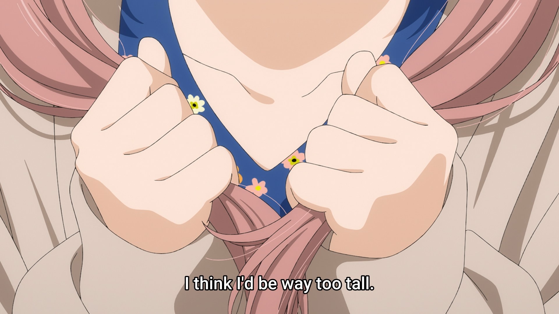 Akira finally speaks after Marin leaves the room. She’s actually quite talkative with Juju. Then when Marin reenters the room, you can literally see Akira put her head down. Amane is pretty observant, so he instantly goes to talk to Akira when the group takes a quick breather. Their situations are polar opposites: when it comes to their hobbies, he has a supportive family, and she doesn’t. By connecting on that level, he can thus broach the more difficult topic: what’s up with her and Marin? Gojo even happens to walk by and join in on the conversation. Unfortunately, Akira answers the question in the most drama-stirring way possible: she doesn’t want to be around Marin or even talk to the girl. And then we don’t get to hear the rest of the conversation if it even continued. In my shoes, I would’ve asked her why, especially if they’re going to do this group cosplay. Look, let’s clear the air. Why would you want to go into a project with bad blood? But it’s also possible that the boys were stunlocked into silence by her answer. Again, I doubt Akira is actually a hater; I just can’t see it. But I am disappointed that My Dress-Up Darling tries to leave us on a bit of a cliffhanger regarding her actual feelings. The vibes in this show have been so chill. I don’t want the series to resort to cheap drama-baiting. It’s better than that.