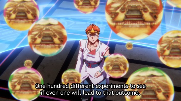 Big lore dump episode. Basically, there are no time loops. Rather, Seimei somehow has the ability to create parallel worlds, and he’s been pitting them against each other in a twisted tournament — something about trying to achieve the perfect civilization through ruthless competition. Naturally, people don’t want to fight each other, so he has to cast an illusion to make you see your foes as onis. Once one of the worlds comes out on top, he repeats the process. Seimei admits that he’s pretty much insane.