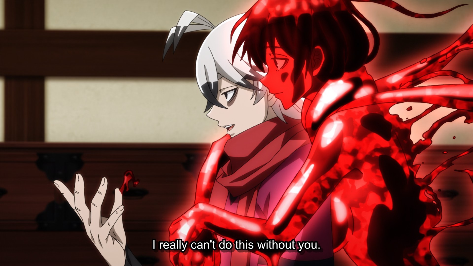 Then to top it all off, he bites into his finger to unleash his blood, which then shapes itself into the likeness of the dead girlfriend. Holy cornballs, my guy. Who wrote this shit? And what is the monster doing this whole time? Rokuro’s just talking to the bloody figment of his dead girlfriend! LOOK, HE EVEN HAS TIME TO BE EMBRACED BY HIS DEAD EX. JUST HIT HIM. JUST FUCKING HIT HIM.