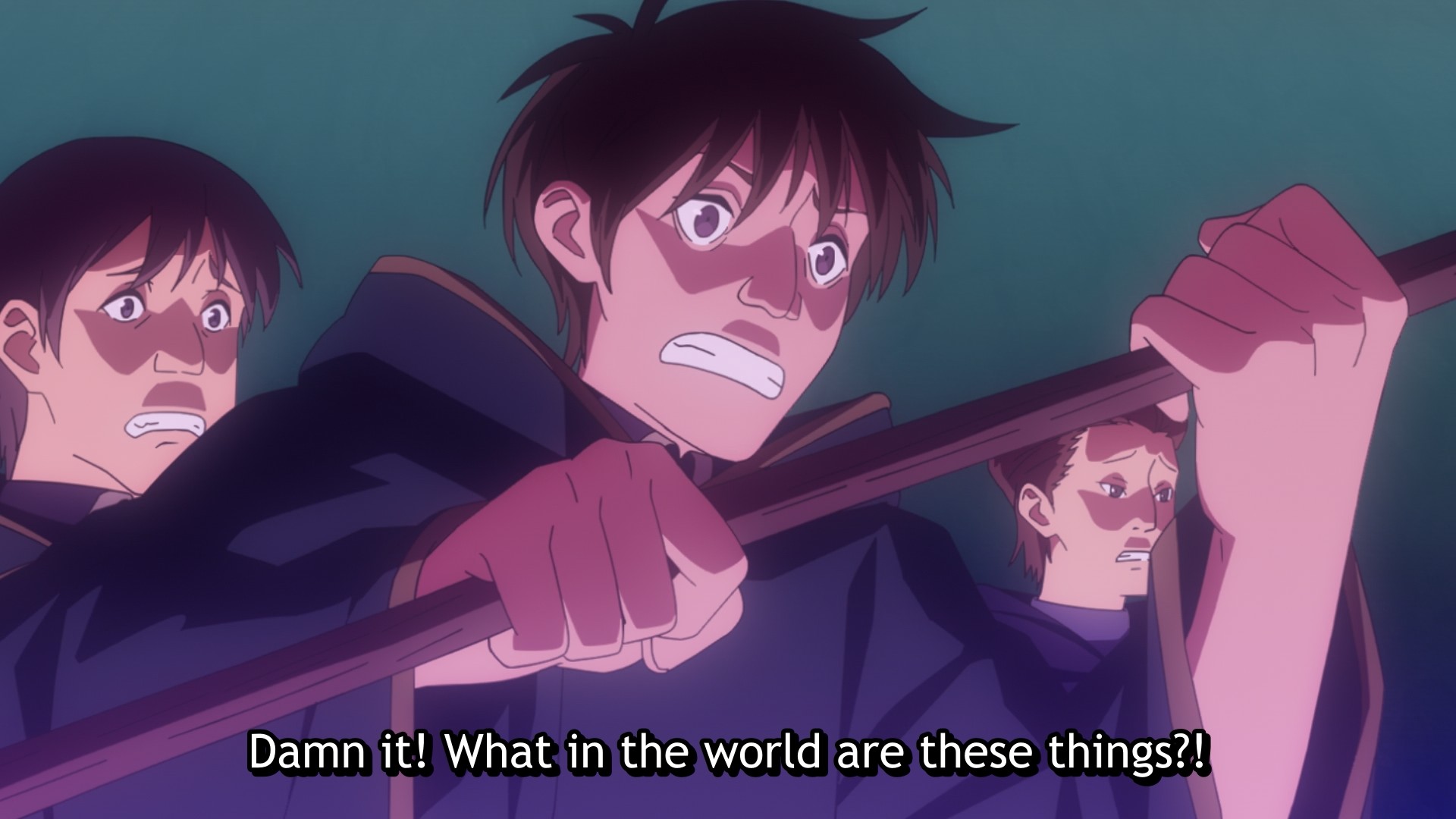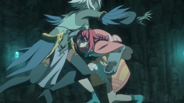 At first, it seems like the anime would continue unfurling its two plot threads separately. While Ryo is busy flirting with his future elf girlfriend in the library, Abel and the research team get teleported to a floor full of demons. There’s even a demon prince, i.e. a baby demon lord! Oh no! Well, you need not worry, because we only see a bunch of faceless grunts die. Even when the situation calls for it, the anime fails to build any sort of tension. Sure, Abel’s mages run out of mana, so he tries to fend off the demon prince all by his lonesome. But your best bud can’t die, so Ryo suddenly appears out of nowhere and starts… well, he starts being a real dick about it.