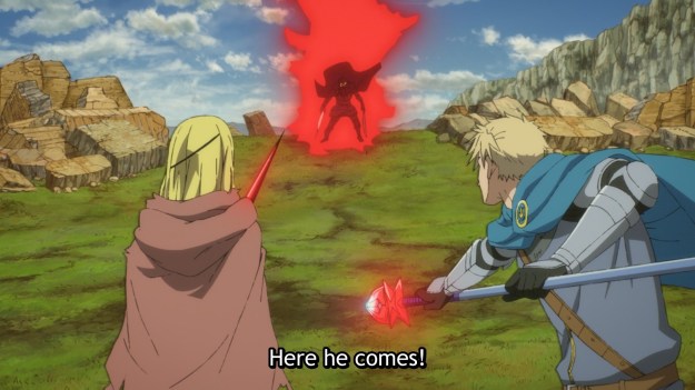 The other half of the episode is the continued struggle against Drel, but this time, Rhode finally makes it back in time to join the fray. Frankly, it’s your typical anime battle, so I don’t care for it. The animation this week is pretty janky, which is disappointing to see when the stakes are so high. But more importantly, the sequencing of events just leave a lot to be desired. For example, Drel does the anime classic “I’m right behind you now” trick, but he keeps slashing at the ground like a dumbass. Dude, just slash them directly. Pointy stick at soft human body. Do it. Quit playing with your food. Moving along, Drel is only super fast when he can’t do any real damage. When our heroes need time to come up with a plan, Drel suddenly slows down enough for Alicia to yell a command at Rhode not once but twice. I’ve said it before, and I’ll say it again: I love it so much when combatants in anime just fight. It’s so much more raw and compelling than… whatever the hell this is.