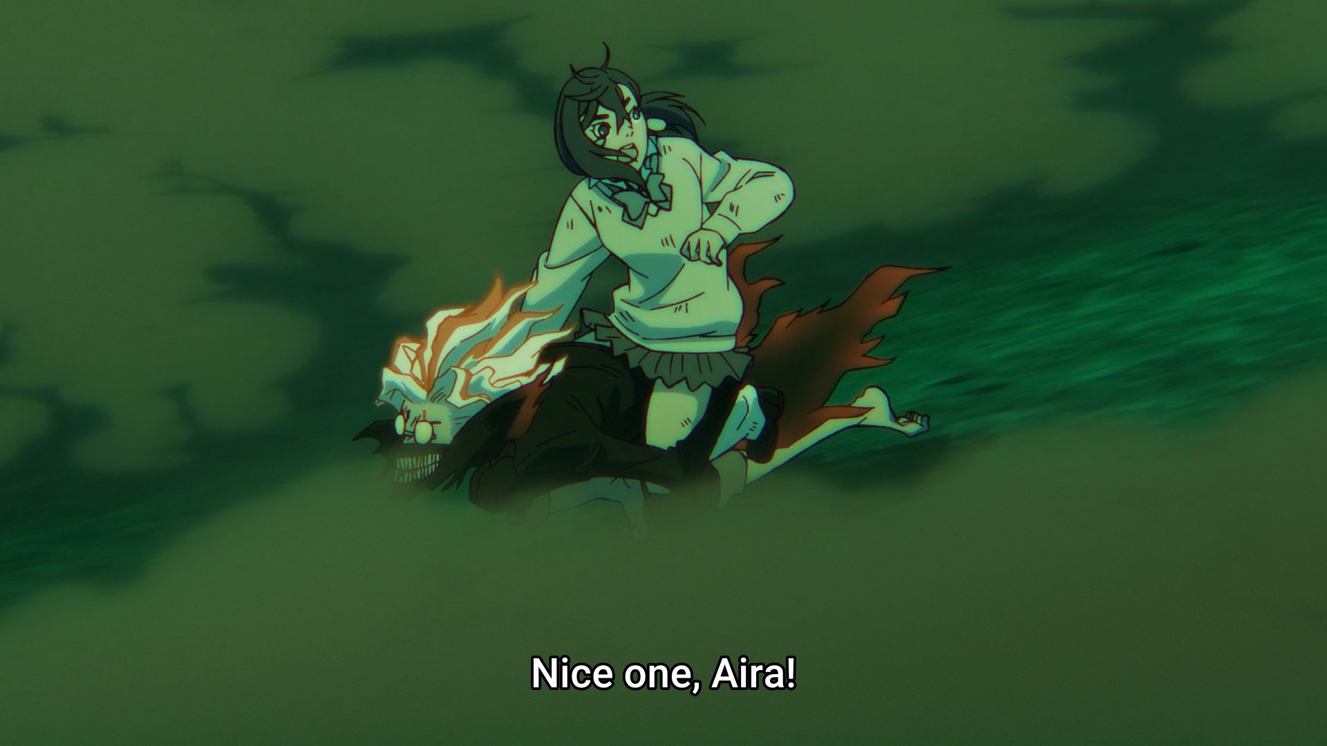 Even though they couldn’t beat the kaiju, it is kind of cool to see Momo and Aira take the lion’s share of the action in this week’s episode. For the most part, Okarun is simply giving Momo a piggyback ride. A small reason why I tend to drop shounens is because female characters often get sidelined. I don’t often cover shows where there’s a huge gender imbalance, because I frankly just don’t enjoy watching those series. Sure, there are fantastic exceptions like A Place Further than the Universe, but those are rare. Hell, I forget the name, but I remember a volleyball anime that straight up acted as if guys didn’t exist at all. It was so weird. In any case, Momo and Aira are doing a lot of the heavylifting here, and this serves to really accentuate their similaries. For instance, it’s funny how they both have the ability to extend “arms” out — Momo with her telekinesis and Aira with her hair — and grab stuff.