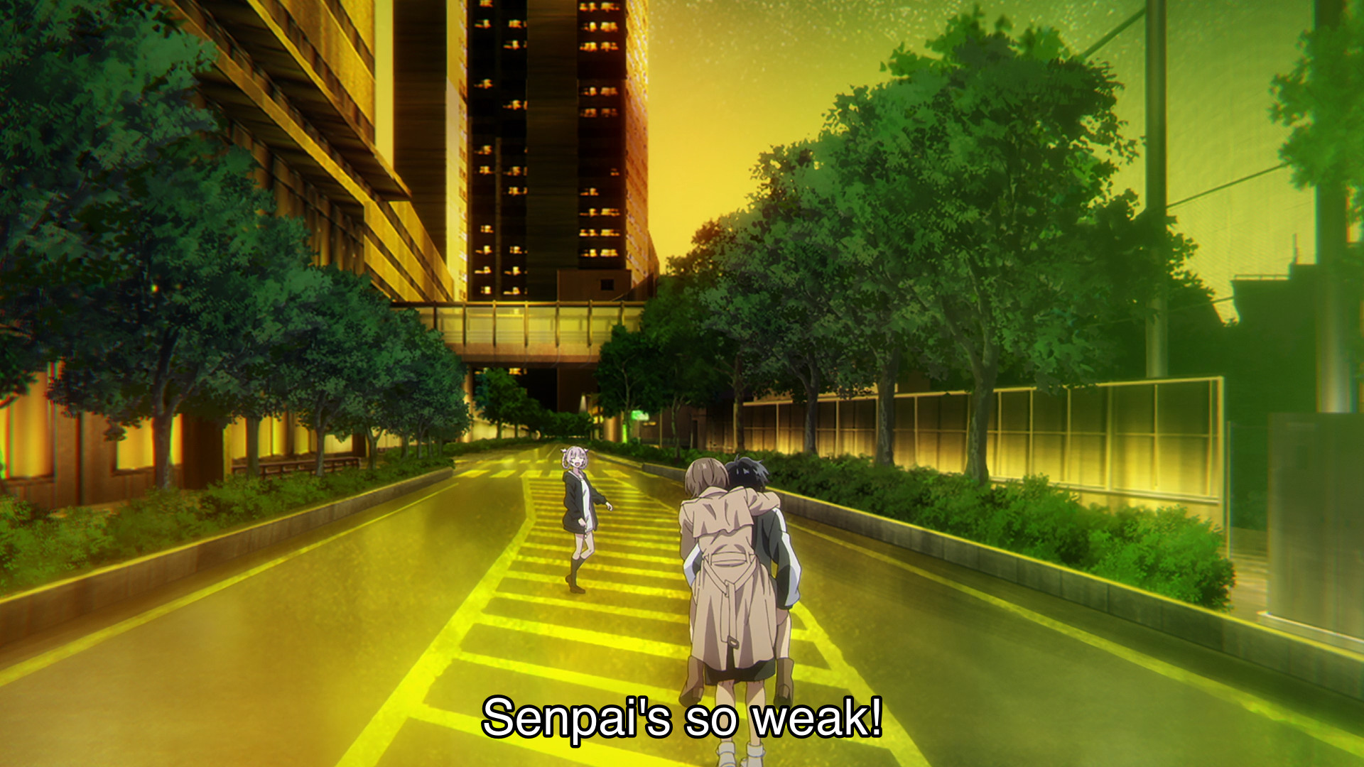 When the story resumes, Kou and Nazuna are still hanging out with Mejiro — well, a very drunk Mejiro who needs help just getting back to her apartment. This is a far cry from the tense atmosphere just two mere episodes ago. I take things too seriously, so I can’t exactly let bygones by bygones. Mejiro has admitted to torturing and experimenting on at least one vampire. Was it an evil vampire? I don’t remember. But does that even matter? We have laws against cruel and unusual punishment for a reason. It’s great that Mejiro and Nazuna can be friends again, but the former didn’t just do fucked up things. She had a fucked up mentality. Yes, there’s a reason she turned out this way, i.e. losing her family, but I don’t like wiping the slate clean like this. I don’t like erasing any part of our history. I’m not saying Nazuna and Kou should abandon Mejiro. Nor do I need to see the woman self-flagellate until I feel as though she has atoned. But the atmosphere is all hunky-dory now, and it doesn’t feel right.