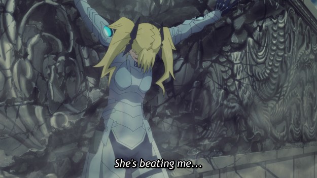 Well, we soon discover Shinonome’s true role in this arc: nearly dying in order for Kafka to swoop in and look all badass. And that’s exactly what he does despite her futile protestations. “Nuuuu, you must run away shounen protagonist! We can’t afford to lose you! Just leave me to die instead!” Uh huh.