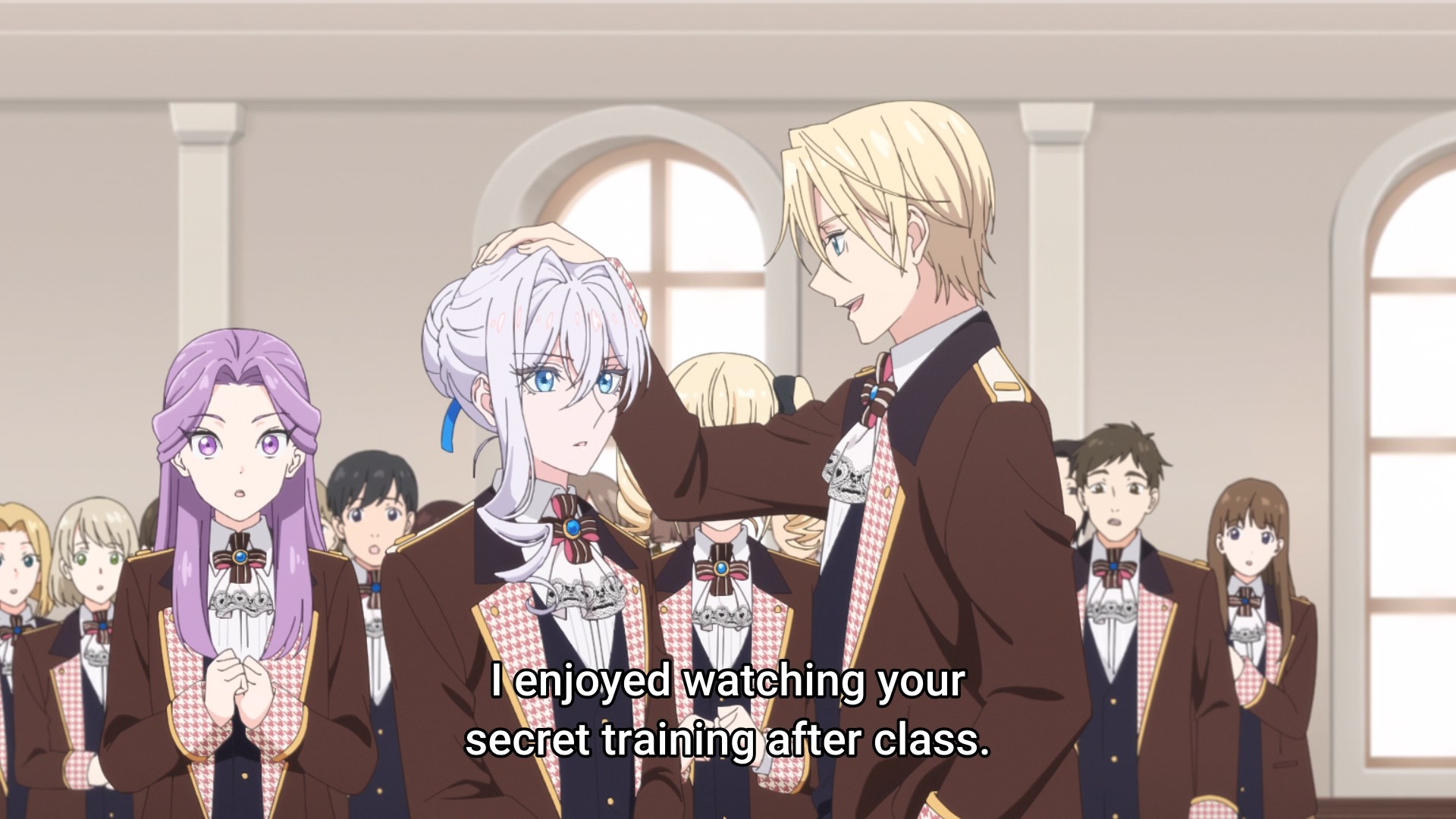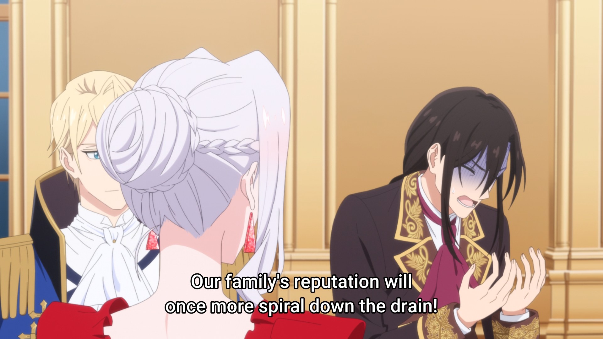 Want to watch a heroine beat people up while her love interest giggles on the sidelines? That’s pretty much what it feels like to watch this show’s first two episodes. Like most anime, May I Ask for One Final Thing? starts us off with an all too familiar concept just to then add a twist or two. Scarlet, a young noblewoman, is unceremoniously dumped by her fiancé Kyle in front of a bunch of nobles at a party. The haughty prince then proclaims his love for Terenezza, accuses Scarlet of bullying his new woman, and thus labels her a villainess. I think I’ve seen several isekai series with this exact setup. The most recent one that comes to mind is I’m the Villainess, So I’m Taming the Final Boss. The heroine in that show goes from one brother to another, and funnily enough, it looks like our Scarlet might be doing the same. So what’s the twist or two that sets this show apart from its ilk? First, this is surprisingly not a story about a girl who has been isekai’d into her favorite otome game despite its painfully clichéd prologue. Second, Scarlet doesn’t do the typical thing of running away. Instead, she does her talking with her fists, and I won’t lie: it’s kinda refreshing to see.