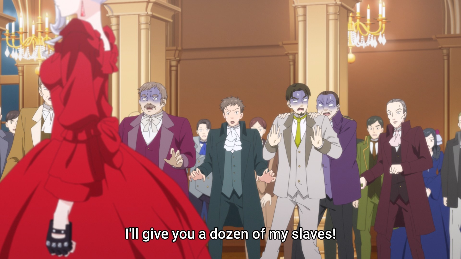 As an aside, I find it interesting that the ED is all about Terenezza dressed up as various fairy tale heroines. I wonder if this is still an isekai except it’s just Terenezza who got isekai’d and not Scarlet.