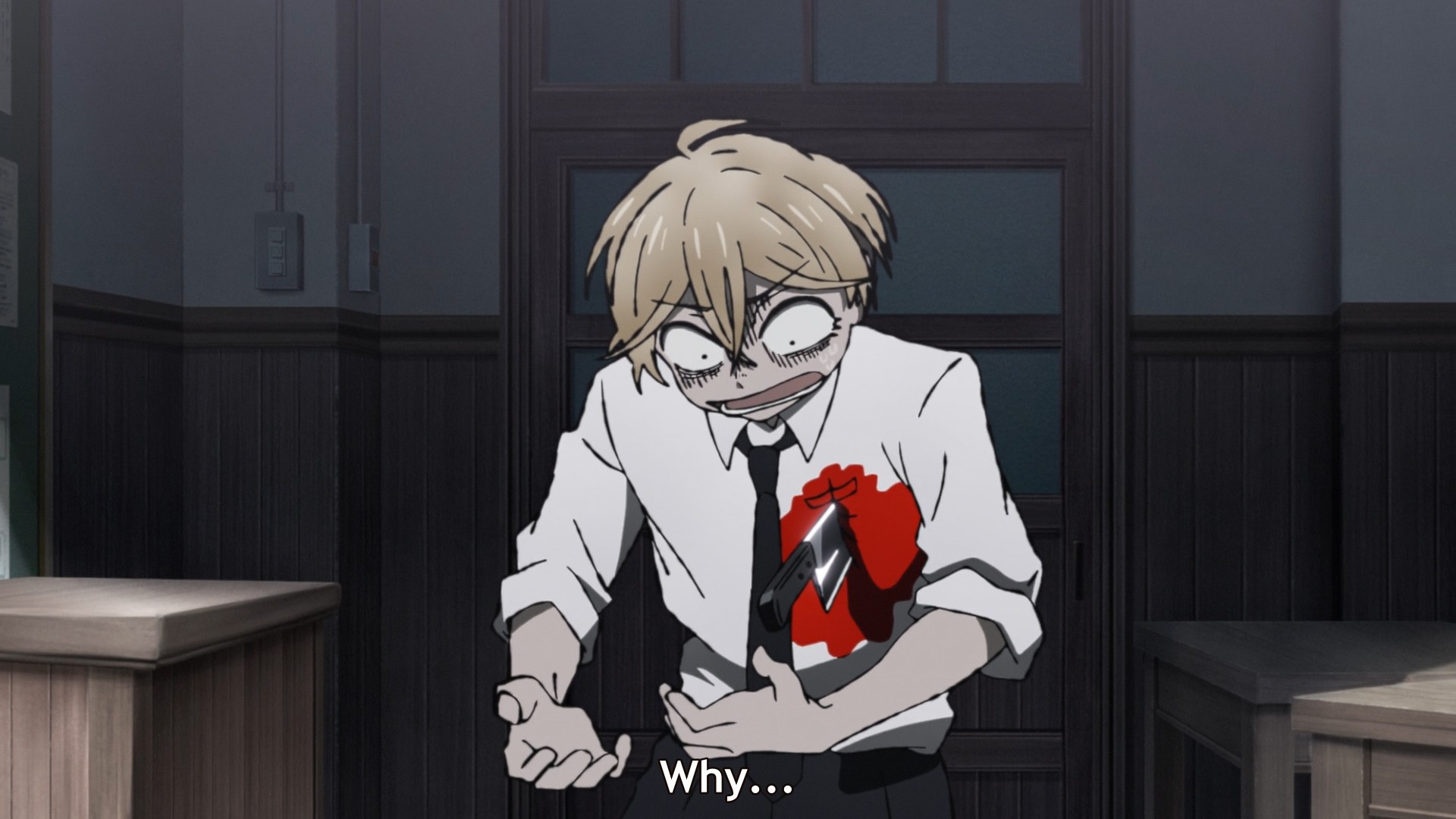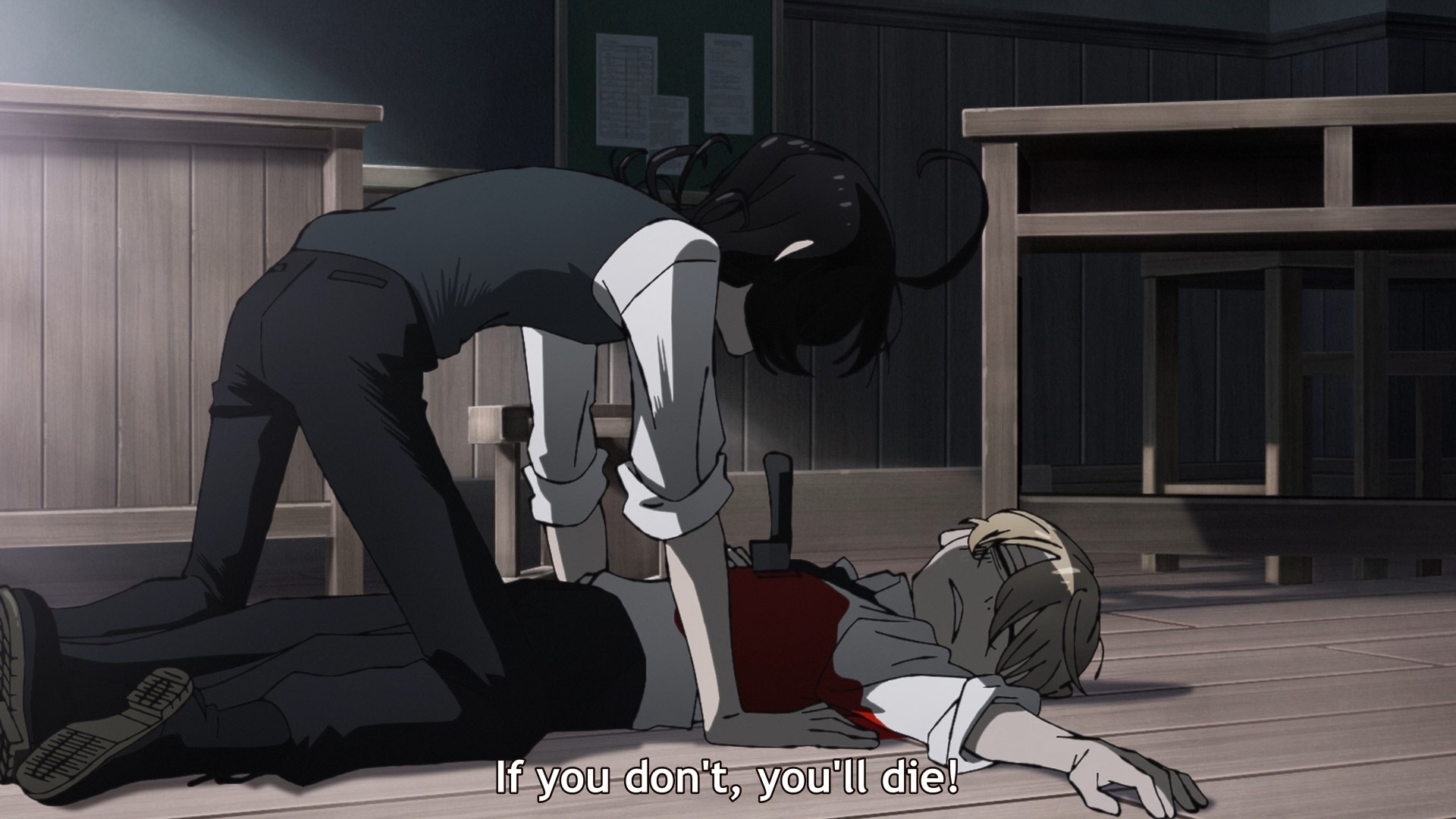 Well, Sanda isn’t the only one yearning for love. Fuyumura is so desperate to find her friend that she would risk killing her classmates. Initially, she tries to get Sanda to wear red, because this would complete his transformation. When he refuses, she doesn’t hesitate to stab him through the chest and paint his clothes red with blood instead. Even when it looks like Sanda might die, she seems primarily concerned about not being able to use his powers. This isn’t the only time the girl seems to blithely ignore the simple morals and ethics of don’t go killing people. In order to test Sanda’s capabilities, she later tells him that she’s hidden a bomb in their class. If he doesn’t jump into action, all 22 of their classmates will die. She isn’t bluffing either; she literally has bombs strapped to her body. How does a middle schooler even know how to make bombs? Who is this girl? And either Fuyumura is really confident in what she believes or she just doesn’t care about other people. Maybe a little of both. It makes me wonder if her desperation to find Ono is born from something more than a mere love for one’s best friend.