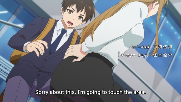 Alright, to be fair, he doesn’t touch the high school girls without their consent. Usually. You know how touchy anime protagonists can get when they trip and fall. This show’s premise feels like something straight out of a hentai manga. We even get a crotch shot seconds into the episode. Then look at the way the anime emphasizes this poor lady’s ass. It doesn’t even look like it’s attached to her torso anymore. Dude, c’mon, how am I supposed to get turned on by this body horror? Eventually, we get an uncensored nipple, so it’s one of those shows. Gotta laugh at the censored vagina, though. That’s a bridge too far, I suppose.