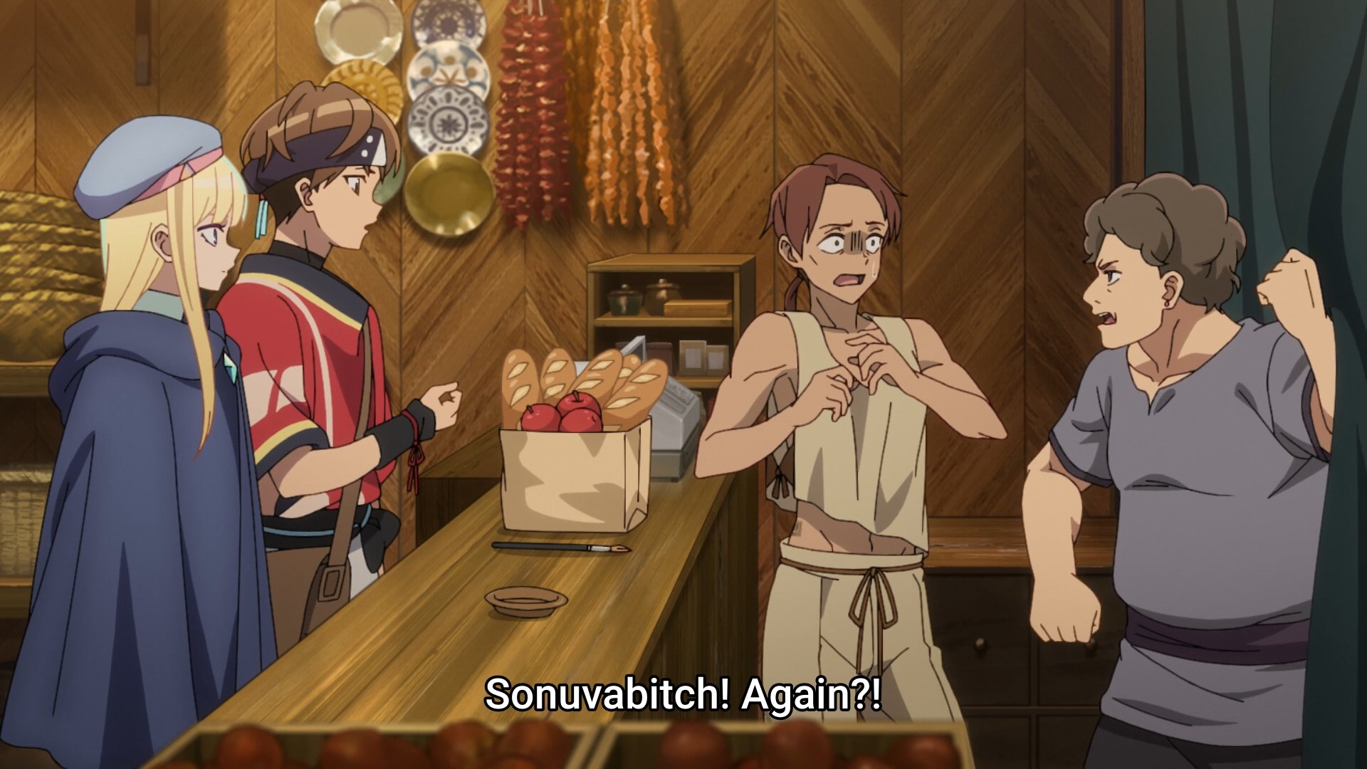 Moving along, we also meet Amoru, a slave girl who aspires to become a storybook author like her parents. Unfortunately, that sort of thing is contraband for whatever reason. This thus motivates her to betray our duo in a misguided attempt to get her parents’ banned books back. Karmic retribution has her watch as the over-the-top Marlum burns the last book in her possession. Obviously, he was never going to honor their deal, and she’s naive (again, this is a running theme in this narrative) to have believed him in the first place. How the book catches fire in the rain, I don’t know. Needless to say, Akira will go against Yugure’s practical advice and attempt to rescue Amoru from a bunch of armed soldiers. Bro, you don’t even have a weapon. What exactly is your plan? Again, I want to root for this kid and his ideals, but he’s so dumb about it. I guess his only genius is being able to understand Towa’s papers.