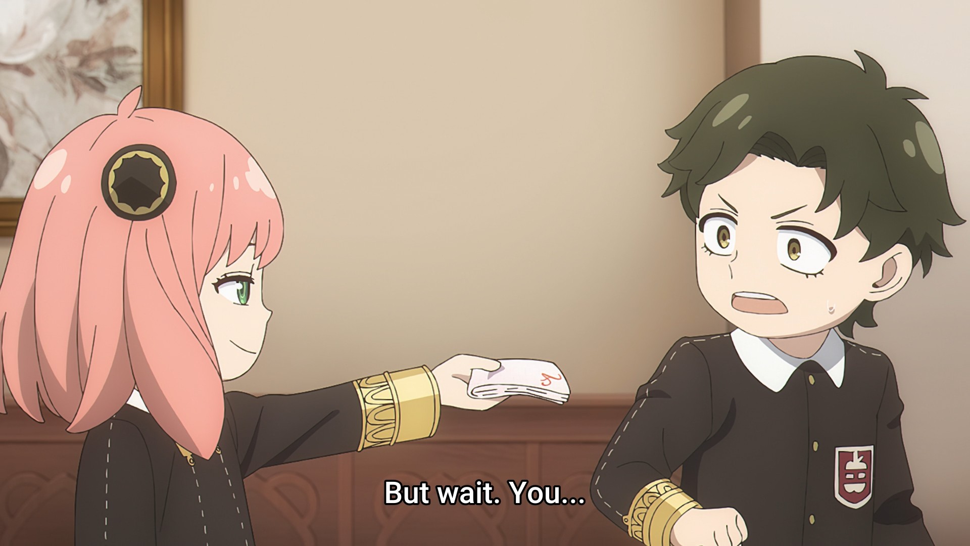 Since we reintroduced the family and Loid’s colleagues last week, it’s time to reintroduce Anya’s friends this week. Becky, Damian, and Damian’s flunkies thus make their triumphant return. Personally, I think Becky’s hilarious, and it’s so silly to me that some people tried to paint her affinity for Loid as problematic. Kids have innocent crushes all the time. It’s up to the adults not to be weird, and Loid clearly isn’t a weirdo. As for Damian and his flunkies, eh. I’m pretty apathetic to them. But there is one thing that bugs me: I hate the idea of shipping kids. Something about it just bothers me to the core. I know Damian has that “I pick on you but that just means I really like you” thing that children sometimes do, but I don’t find it cute. So what if there are “underlying reasons” for a mean kid’s behavior? At the end of the day, he’s being a jerk.