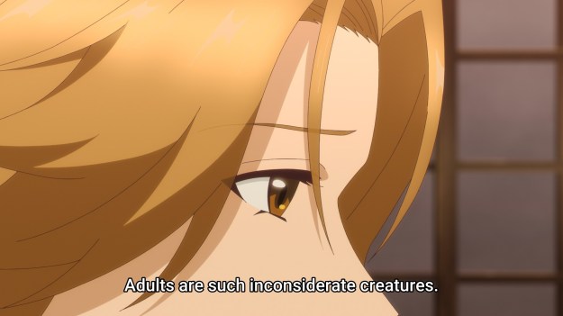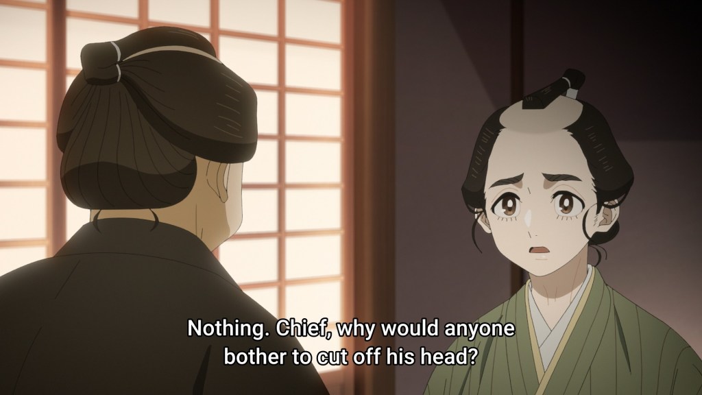 The problem with this show so far is that it had to go and give me a mystery only to snatch it away. This week’s episode is maybe 90% non-mystery-related chatter: how Ichitaro can’t be sneaking out due to his weak constitution, how his mother would kill herself if he died, how a friend is envious of Ichitaro’s responsibility-free life (the grass is always greener), yadda yadda yadda. Then there’s the teeny, tiny 10% near the end where we finally learn more about the mystery. Somehow, the victim, a humble carpenter with apparently no debt or woman-related troubles, was beheaded after Ichitaro found his corpse. That’s it. That’s all we get regarding the mystery itself. Sorry, but Ichitaro’s health and everyone’s penchant for overprotecting him aren’t engaging topics. I find myself bored for the vast majority of the episode only to have it finally pique my interest right before the credits roll. That’s not good enough.