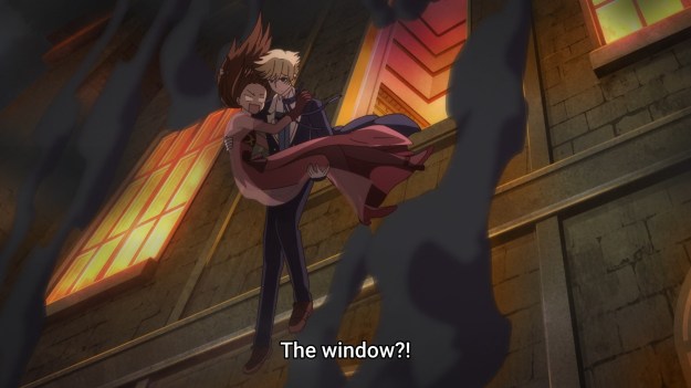 Even now, Sol is still suspicious of Iana. Since he’s watching rKonoha’s every move, Iana must seem very bizarre to him. She must seem like two different people. He says as much when he outright asks Iana who she really is. Her being trapped under fallen debris, however, forces him to come to her rescue once again. This time, he gives Iana the classic princess carry to safety. In other words, rKonoha has triggered his romance route. We started a fire only to let her become the damsel in distress. He’s still suspicious of her, but those worries will slowly ebb away as we progress through this new timeline. By why is this happening? And how? Who’s writing this story? rKonoha can only try to change the events from within. She can’t create new events. Why did this fire occur spontaneously? Or is it even spontaneous?