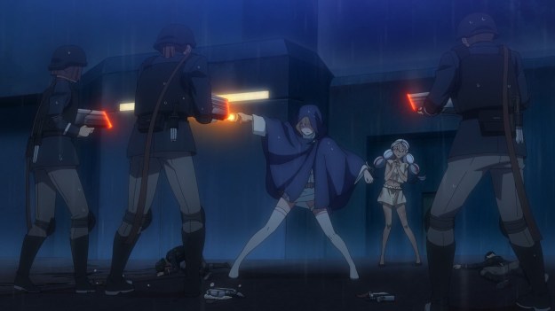 Anyways, Yugure obviously has to save the day again. Last time, she butchered Caniss and his men. Hell, “butchered” is probably downplaying it. Blood was flying all over the place. But for some reason, our android waifu decides to go the non-lethal route this time around. She scares the soldiers off by destroying their weapons. As for Marlum, he just gets a swift kick that sends him flying. Unfortunately, he’s very much still alive. Why are we sparing him exactly? How does this fit her “operating principles” exactly? I don’t get it. He’s just as big an asshole as Caniss. She can’t even get the non-lethal trophy anymore because she already has a body count, so why stop murdering these evil bastards now? Look, when Akira called you heartless, that doesn’t mean spare the sadistic bureaucrat who probably owns slaves.