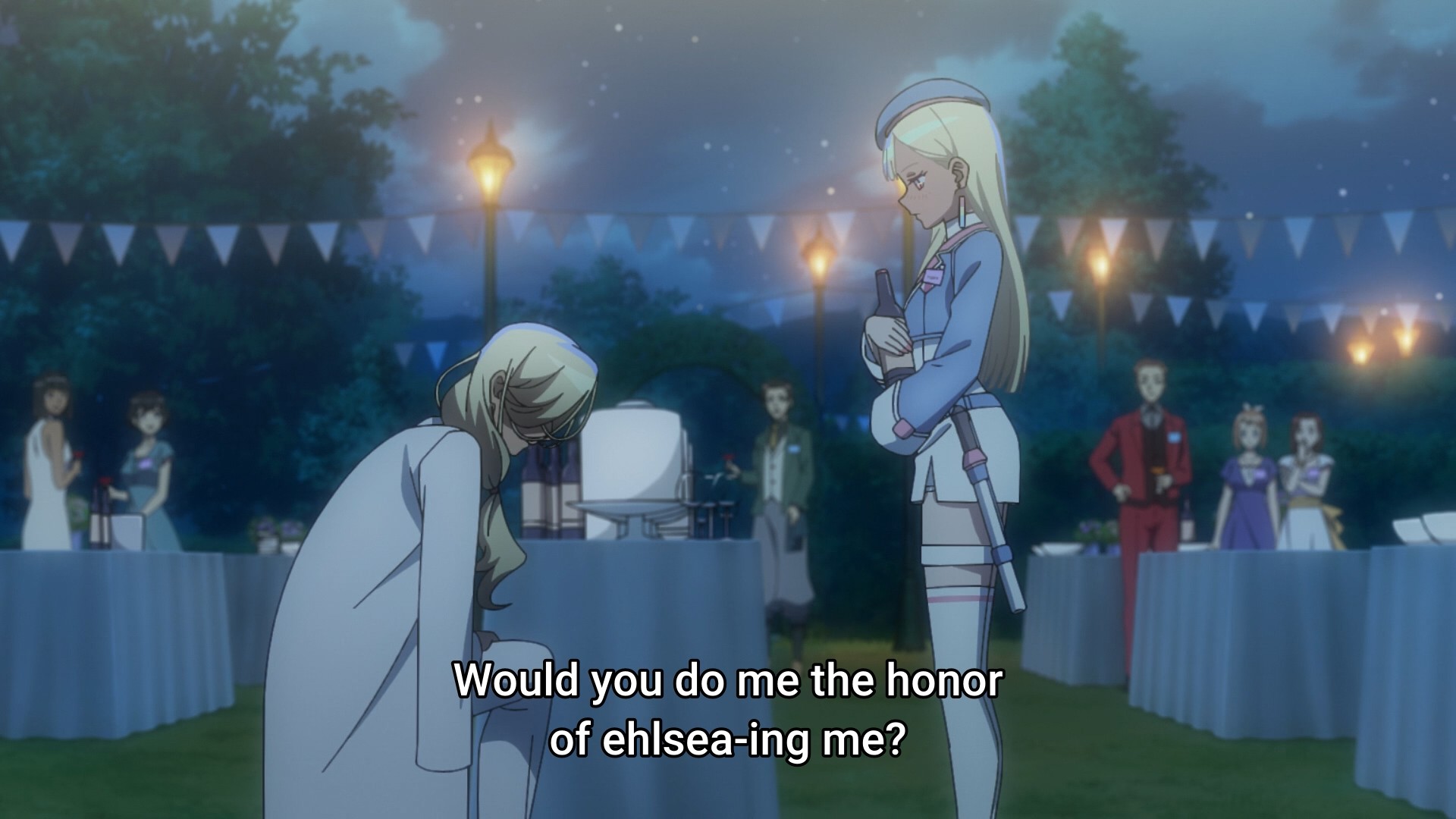 But just like that, we have rescued Amoru in a little over eight minutes. Welp, that was a neat and tidy operation. What exactly are we going to do with the remainder of the episode though? I know, I know, we’re going to talk about getting hitched! I mean, obviously. Why wouldn’t Amoru instantly fall in love with Akira and want to enter into an “ehlsea” with him and Yugure? But when Akira continues to rebuff both girls’ advances, we conveniently stumble upon a town that is holding a matchmaking festival for prospective “ehlsea-ers.” Wow, what a coincidence!