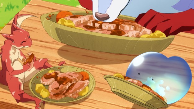When Mukoda finally takes a bite of earth dragon meat, he just says it’s an amazing umami combination of beef, pork, and chicken. That description doesn’t really help my imagination much. Well, he prepares it like a hunk of roasted red meat — something like prime rib — so I guess I’d have to lean towards it being kinda beefy. Hell, he even dumps steak sauce on it. The only thing that gives me pause is that we generally do not eat pure carnivores down to a few exceptions, and I can’t imagine an earth dragon munching down veggies. But maybe they do, shrug. It’s a fantasy world, after all.