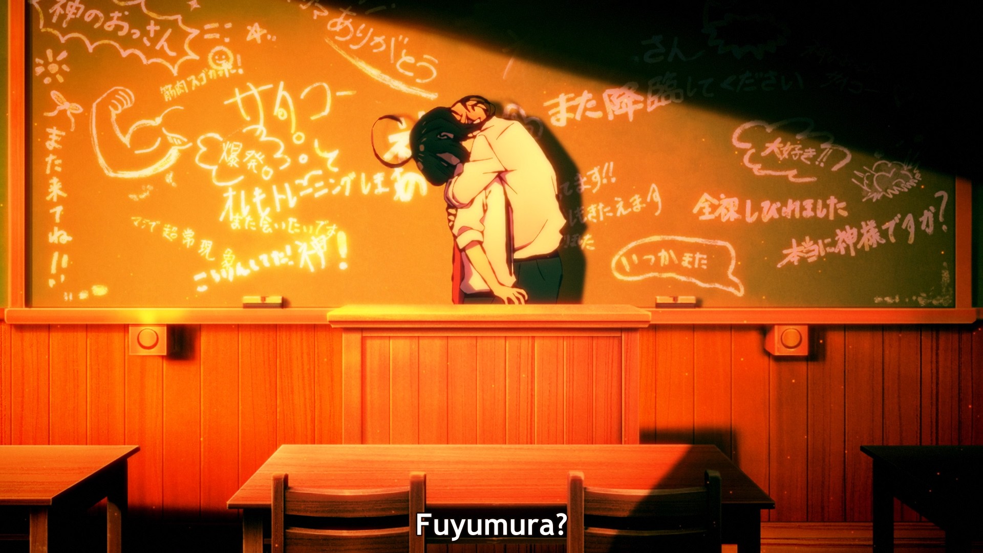 In the ensuing scuffle, Santa ends up literally crashing Ono’s performative funeral. He then does exactly what Oshibu doesn’t want the kids to do: he claps his hands together in prayer and hopes that the very much alive Ono is doing well where she is. He’s also still buck-naked and thus flashing the entire student body. But instead of being shocked or afraid, the kids are entertained. They are amused. For once, they have some stimulation in their dreary lives. They think they’re seeing “God-pa.” In the aftermath, they’ve even started making merchandise for said “God-pa,” and it all makes sense. Of course they wouldn’t recognize Santa, because the myth is all but dead. But more importantly, the naked body is just that: naked. These kids aren’t even allowed to kiss, so a naked body has no sexual context or meaning.