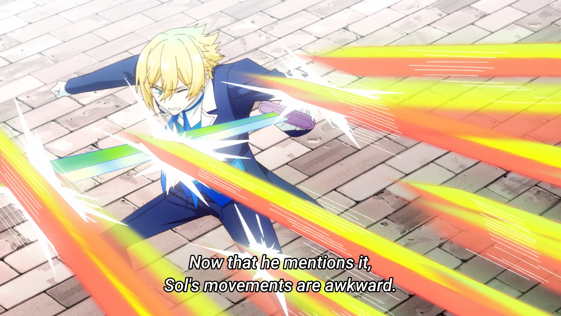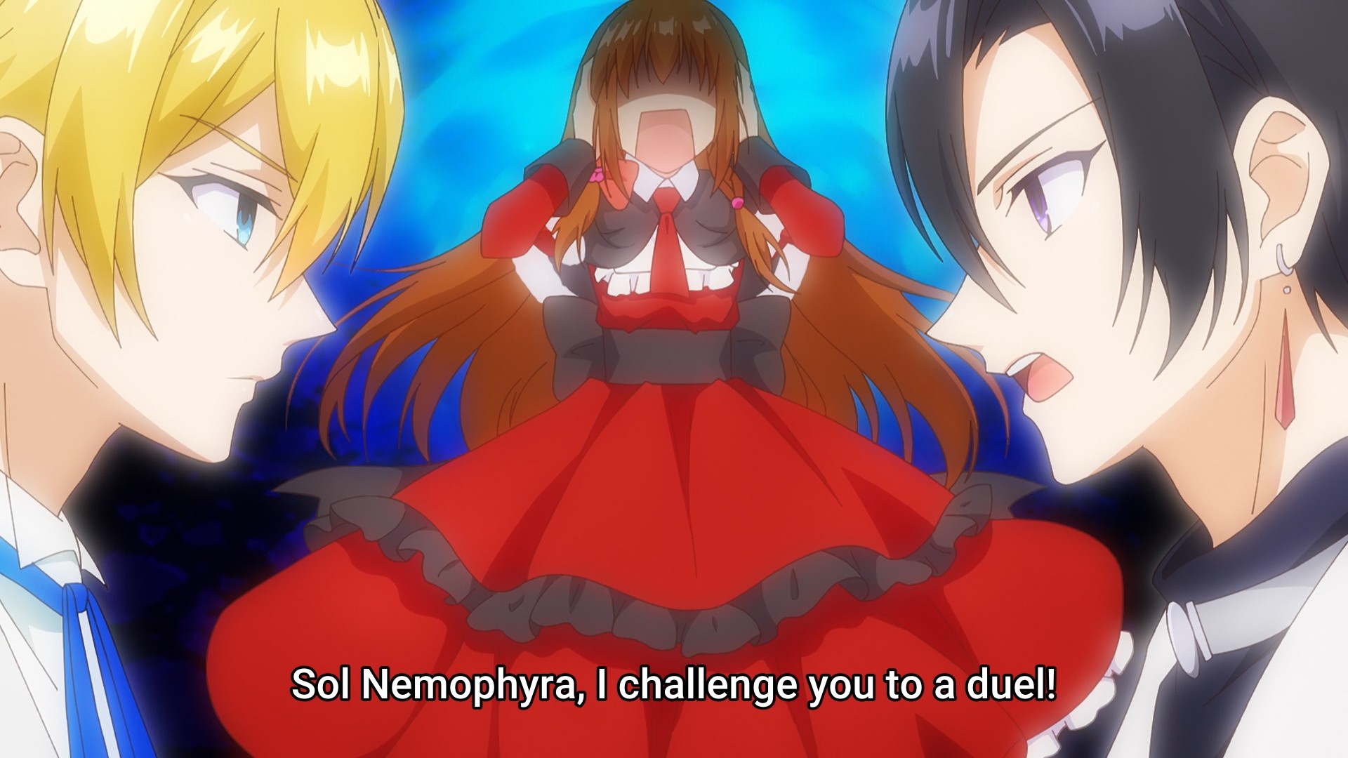 Unfortunately, I suspect that real Konoha will eventually be able to have her cake and eat it too. After failing twice to kill Sol, Yomi finally directly challenges Sol to a duel. According to real Konoha’s self-admittedly embarrassing world-building, the pretty boys must throw down lest they offend the god of battle or whatever. Sure. So they fight and they fight. But as real Konoha observes the duel playing out before her, she slowly realizes that Sol isn’t in his best condition. He probably injured himself when he saved her in last week’s episode. So her solution is to get in the middle of the boys and challenge Yomi herself. We get some backstory about how her chuuni younger self had begged the gods to bestow her with magic to no avail. I suspect Iana will somehow awaken to magic in next week’s episode. But to what end? To take Yomi down? No way. I can’t see it happening — I can’t see her putting down the rabid dog with her own hands. I bet Yomi will have some bizarre change of heart at the last second, so we’ll have our happy, little ending where all the pretty people get to survive. Look, I just think he’s a bad guy. And bad guys need to face the consequences.