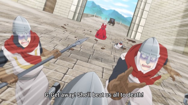 Speaking of the devil, Julius insists that Scarlet keep her new mission a secret from her brother if only to troll the guy. This prince hasn’t grown up, has he? As it turns out, the holy pilgrimage is a rather important ceremonial affair for the kingdom, so it makes sense for the prince to tag along and oversee the entire operation. Nevertheless, he also seems to use this opportunity to cling to Scarlet. If he was actually courting her, he would need to give her space. And if the show was brave enough, she could reject him entirely for being so annoying and clingy. I suspect, however, that this will never happen. He’s clearly the main love interest, and as anime is wont to do, the author will dangle that carrot in front of us until the story comes to an end. It’s sad, but this is the reality.