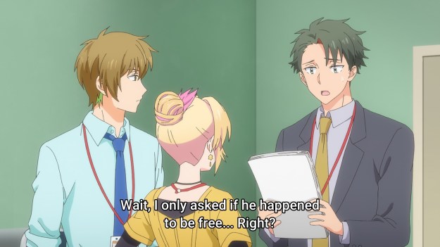 Even when Kannawa gives Kamegawa a reason to go home early, he ends up getting roped into doing another department’s job. Ah yes, I had also forgotten that he’s basically a golden retriever who can’t say no to anyone. He almost got peer pressured into drinking at a work party, and now he’s busy being a lackey for the sales team. Kannawa ends up having to come to his rescue yet again. To be fair, this is the only time all episode that she’s even remotely cool in my book. She’s totally right. Even if Kamegawa wasn’t such a golden retriever, the other guy still put him in a difficult position. It’s hard to turn down work from someone who is your senior.