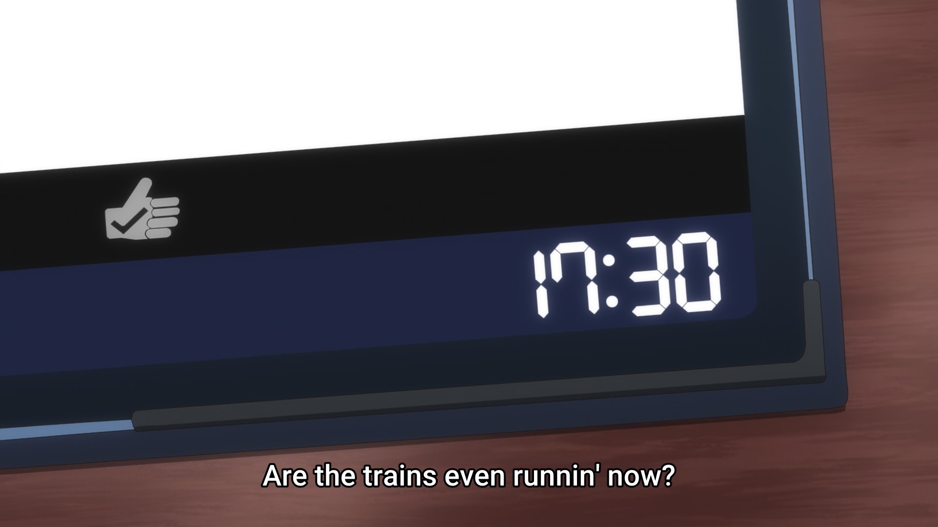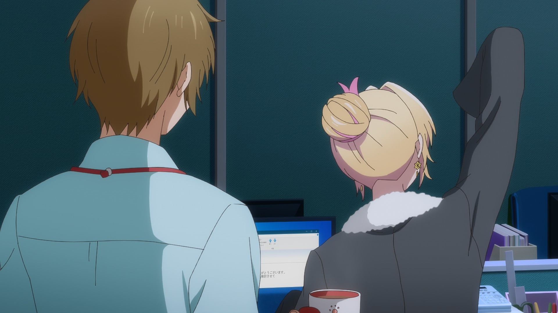 A typhoon is headed their way, so Kannawa wonders if she should tell her mentee to even come to work. Uh, no? There’s no way in hell you would find me in the office if there’s a typhoon warning. Not only that, the weather forecast is literally telling people to stay home. I think it’s wild to put work over your own personal safety, especially when you’re just a grunt in the office. If your bosses can’t understand that, you’re probably working for a black company. But as she leaves her apartment, the “camera” lingers on the umbrella she has left behind. Y’see, you can’t have a doki doki “let’s share an umbrella” moment if you don’t go to work and risk your life!