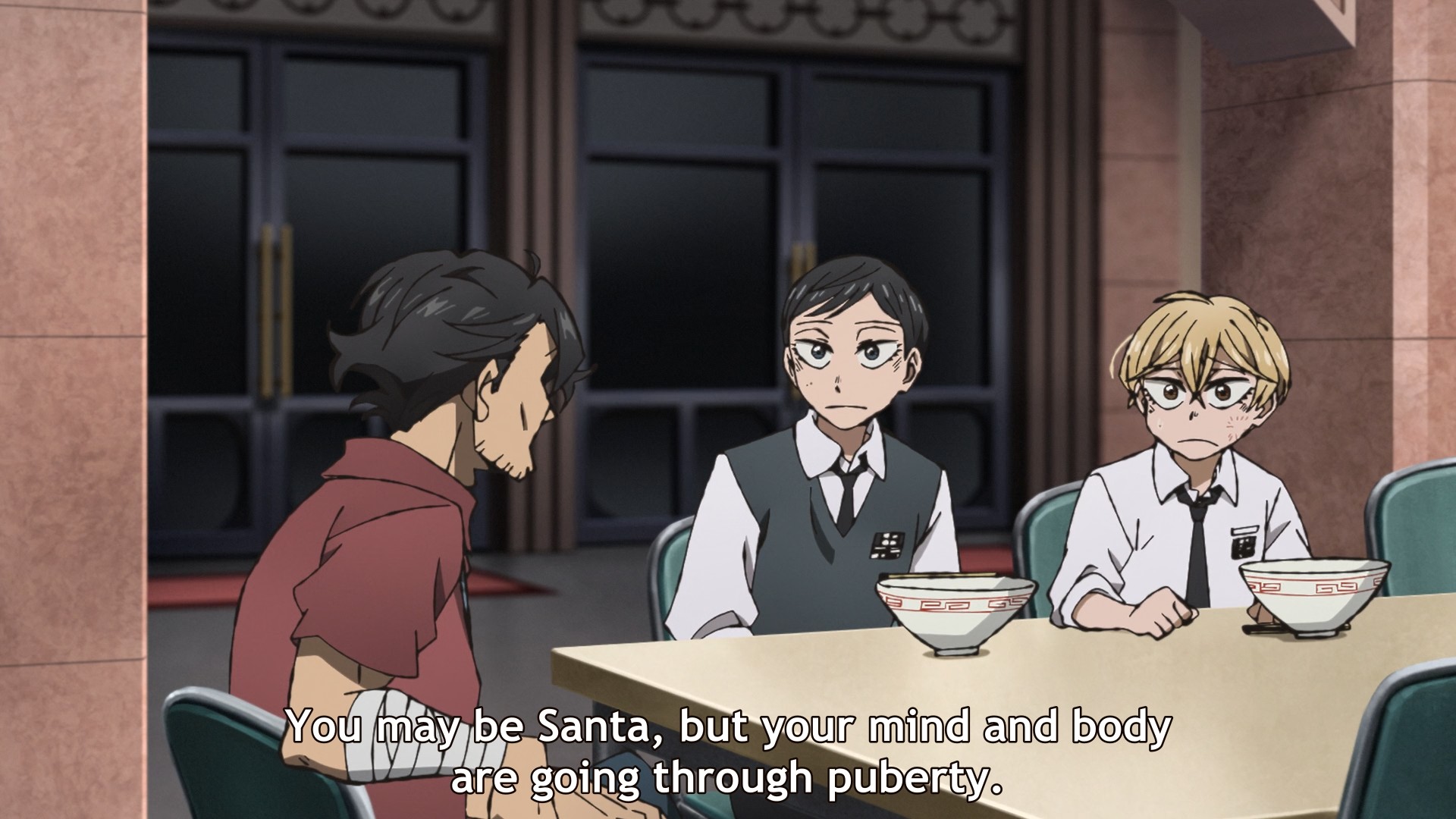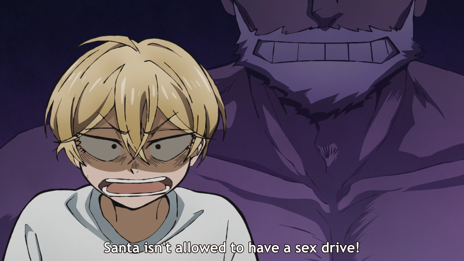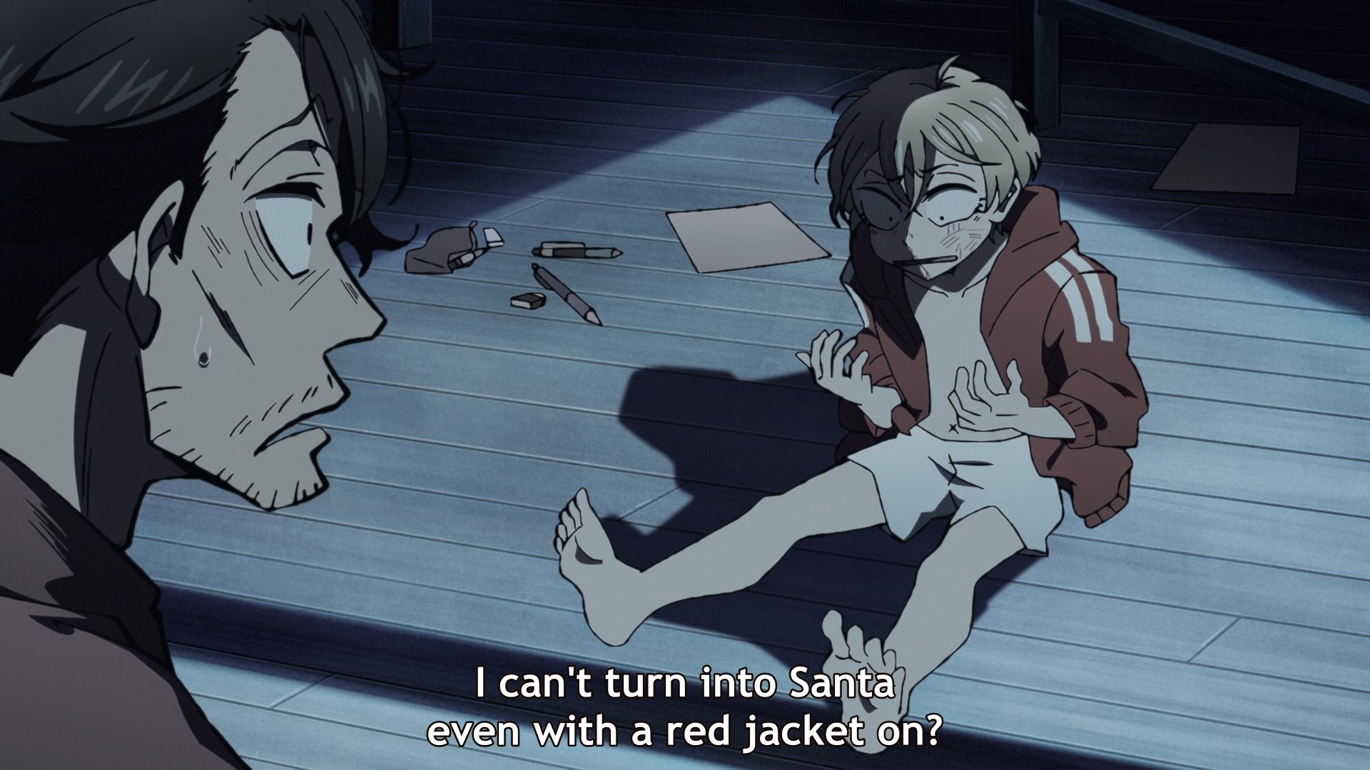 Their relationship is interesting, because as much as Fuyumura’s body confuses her, it’s also something that Ono desperately covets. In a world where kids are unhealthily treasured, growing up can only mean death. After all, Oshibe does everything he can to deny his actual age. We even learn that Yagiuda will be punished with “old age” should he fail to capture Santa. This world creates a strict binary between the young and the old, and this somehow leads to Ono desiring a body that not only defies the young-old binary, but the male-female binary as well. But her complicated feelings for Fuyumura doesn’t exactly resemble a healthy form of love. For the moment, Ono seems to care more about what Fuyumura and her body represent than the actual person beneath the facade. So for now, I can’t really root for this relationship. Ono’s got deep issues she needs to work out.