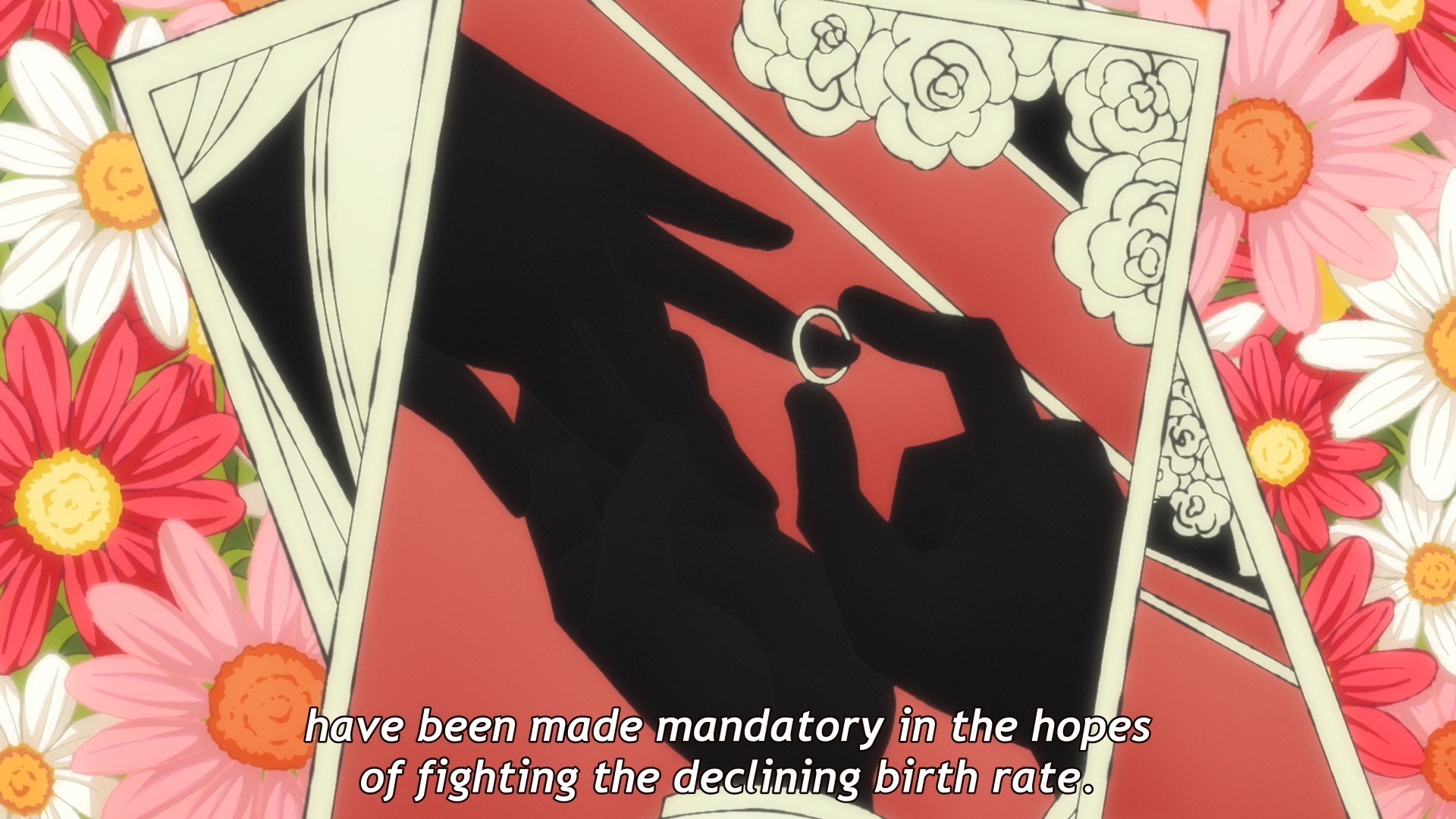 Anyway, there’s definitely something serious brewing between Ono and Fuyumura, but most of it is currently on Ono’s end. The jury’s still out on Fuyumura. After all, she might have conflicting feelings about Santa. Shrug, sexuality is fluid for a lot of people, and having never seen an adult body in the flesh before, who can really say what Fuyumura really desires? Maybe she desires both. Hey, lots of people do. Either way, it gets even more complicated when we find out that our boy Sanda already has a fiancee, but this revelation shouldn’t be surprising. You don’t exactly need a dystopian society to have arranged marriages. That practice is still alive and well in today’s Japan. Maybe it’s not as prevalent as it used to be, but I think roughly 15% of marriages still results from an omiai.