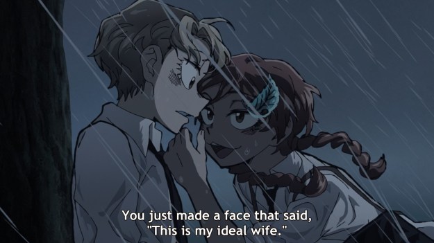Let’s briefly consider Sanda and his fiancee for a moment. Does Sanda and his fiancee Niko have any chemistry? Her opinion of Sanda flips on a dime just because he followed her out into the storm, but can we really take her seriously? I can’t say, since this is the first time I’ve ever seen them interact with one another. We don’t know her all that well other than that she wants to go wild while she still can. Everyone in this show has a distinct fear of growing old, and she’s no different. Still, considering his alter ego, this “relationship” can’t really continue. He has a hard time breaking up with her, though. Eh, just send her an email. I mean, you’re not close to begin with so who cares?