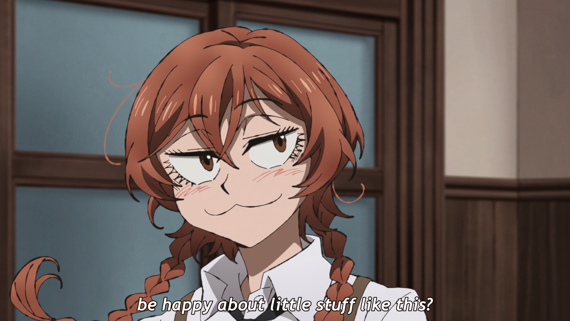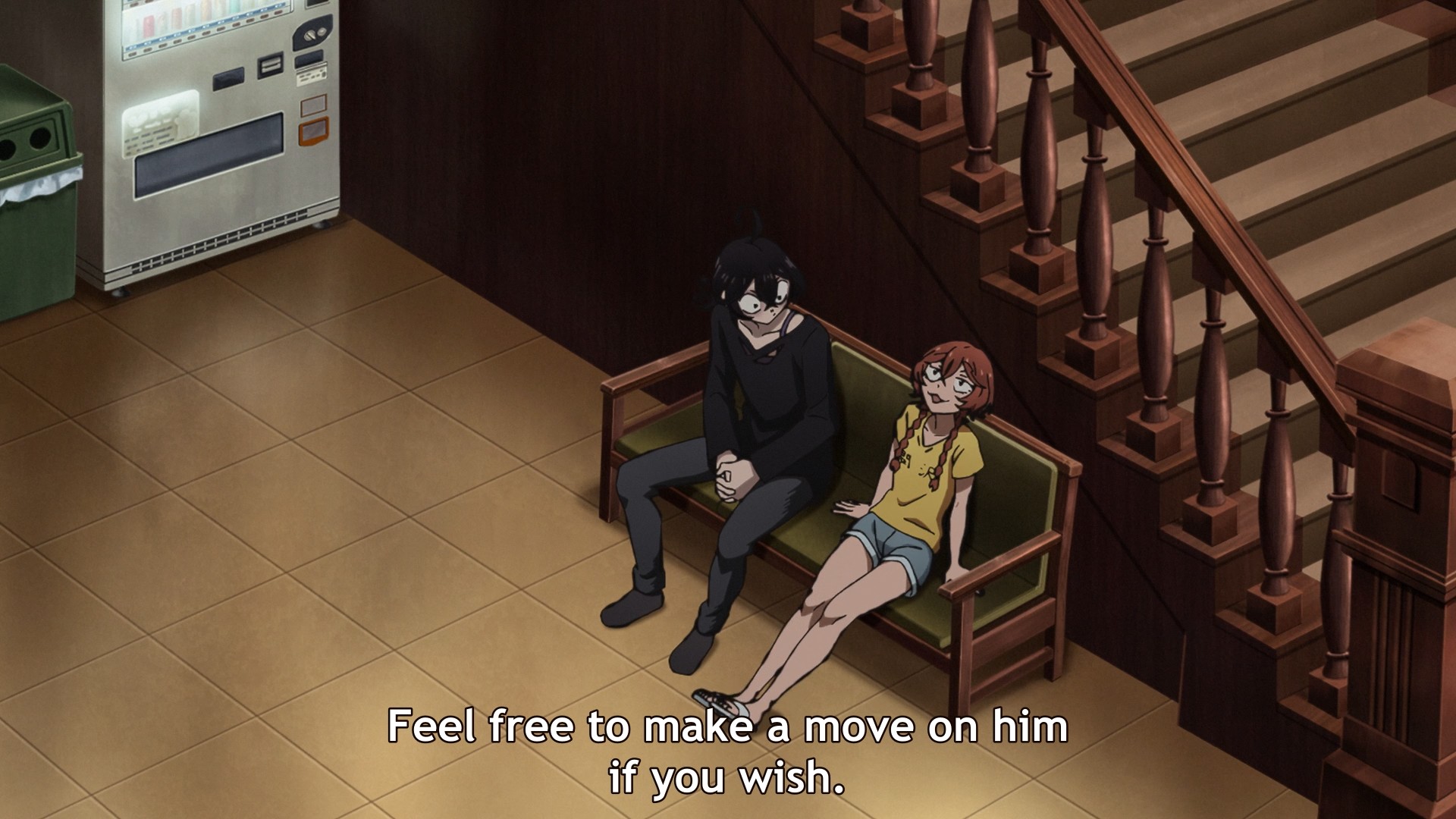 Well, she won’t really have a chance to do that, because Oshibe suddenly jump scares both the girls and the audience. Yep, that’s our cliffhanger. So let’s talk about the B-plot.