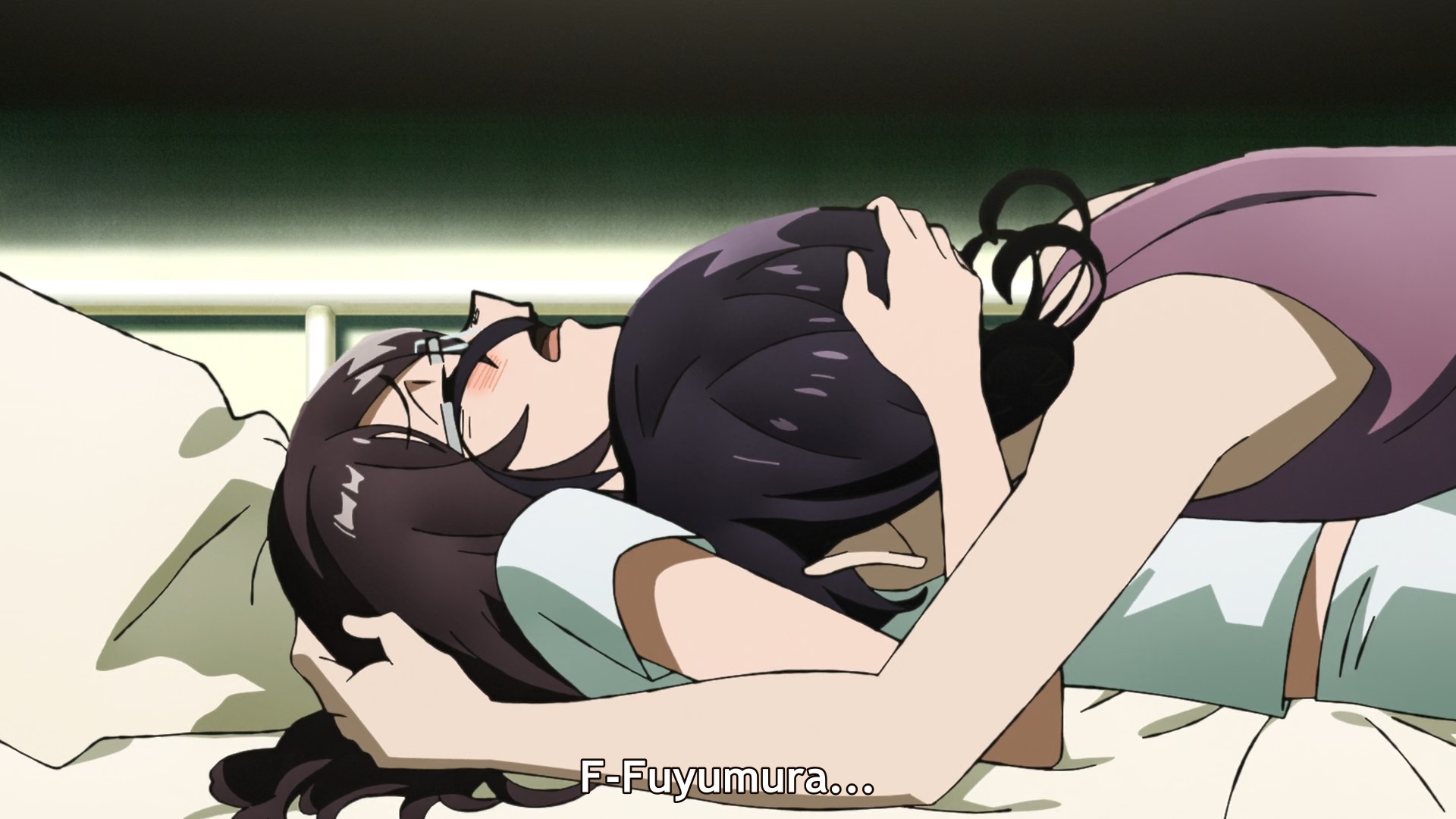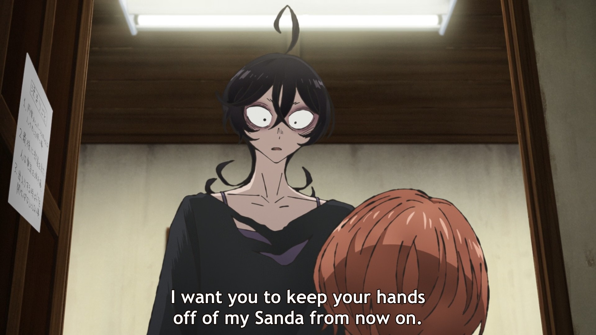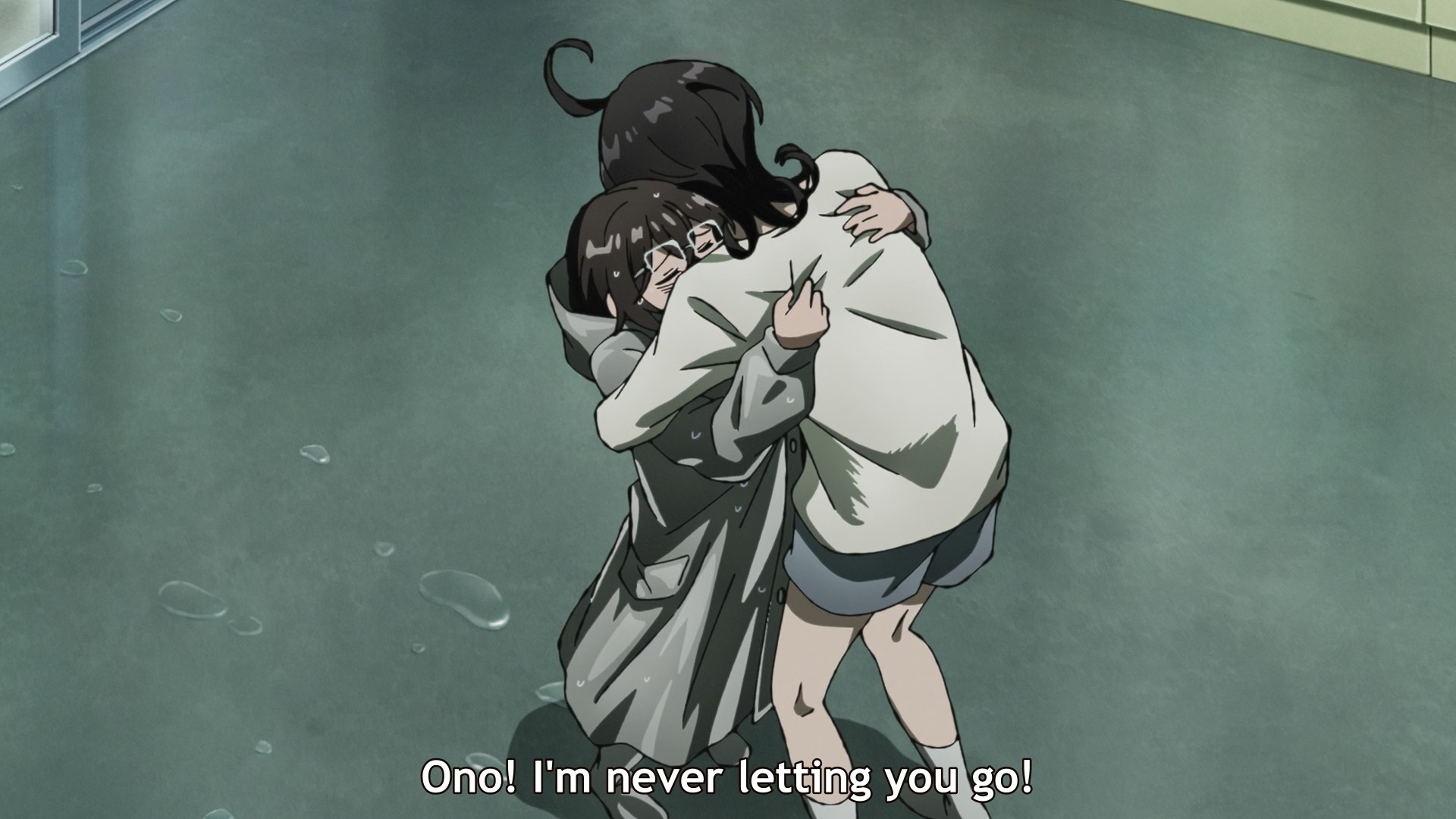 Anyway, Fuyumura confronts Niko and tells the latter to stay away from Sanda. But she’s not actually interested in Sanda like that. She simply doesn’t want him to have any distraction as long as he’s helping her with the whole Ono situation. Nevertheless, her phrasing is a bit suspect, so it understandably leads to a misunderstanding between the two girls. Fuyumura has never been quite sure about her identity, since she obviously doesn’t have the sort of feminine body that society idealizes. The tall and angular girl has only ever felt normal around Ono, and Niko pestering her about Sanda is allowing those body image anxieties to creep in again. It’s only when she’s at her lowest does Ono finally show up.