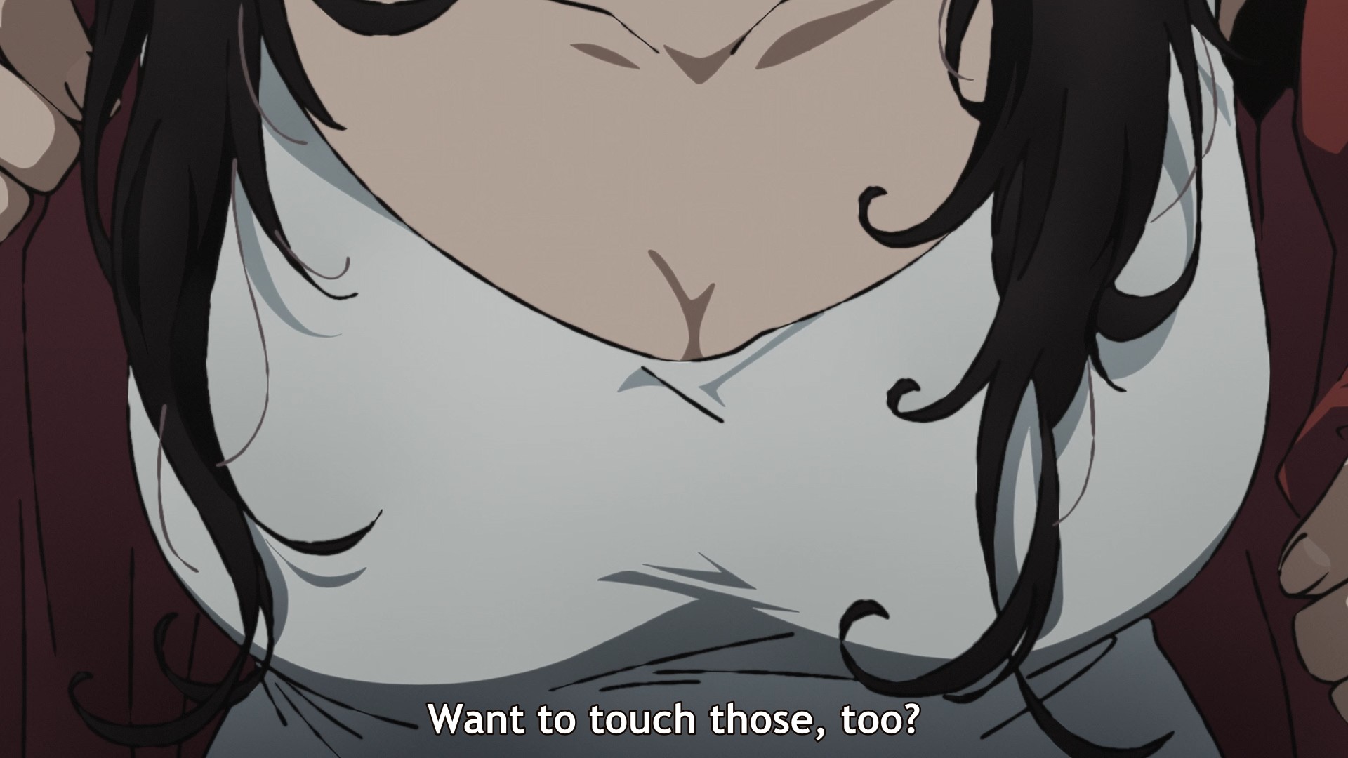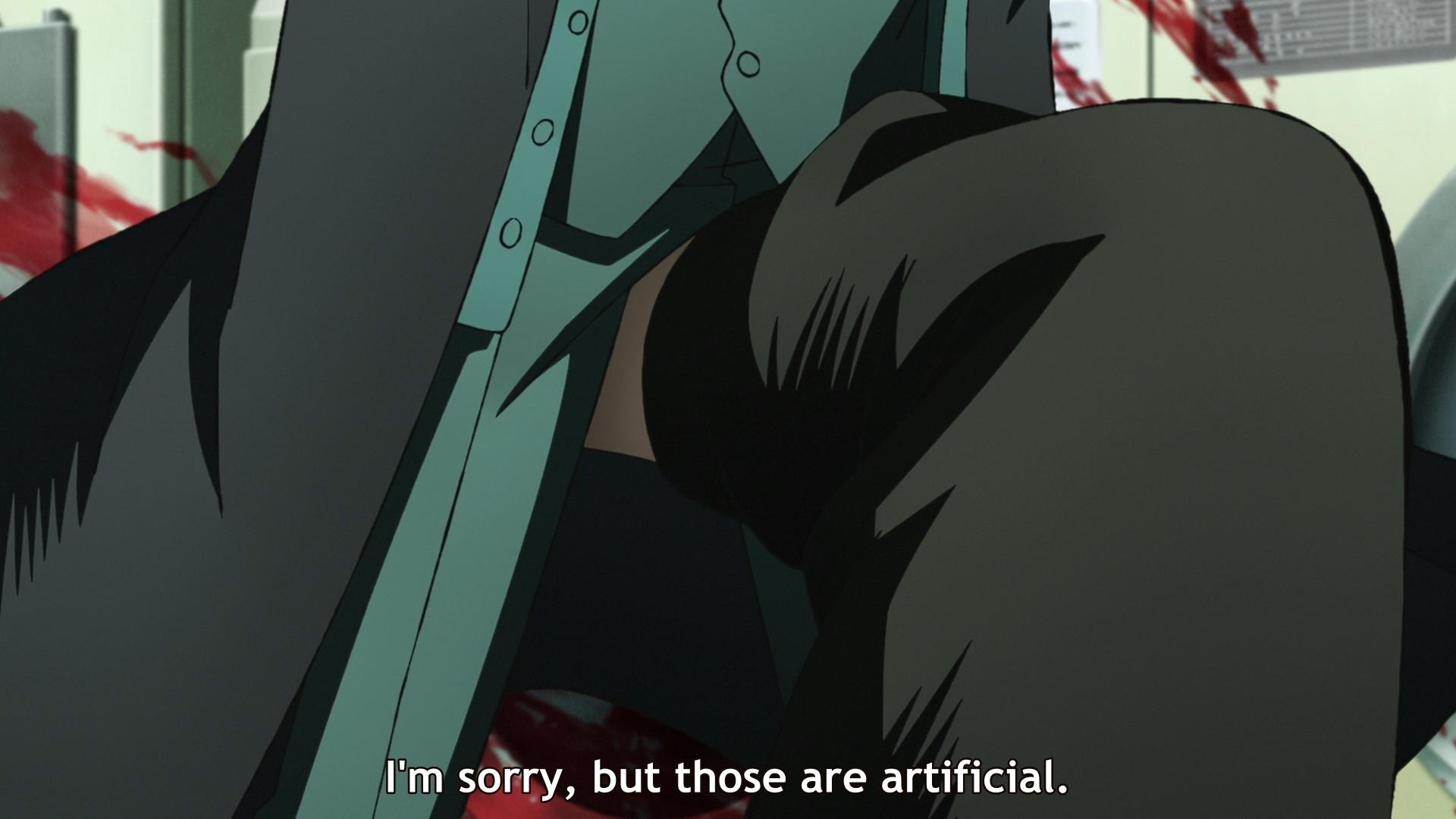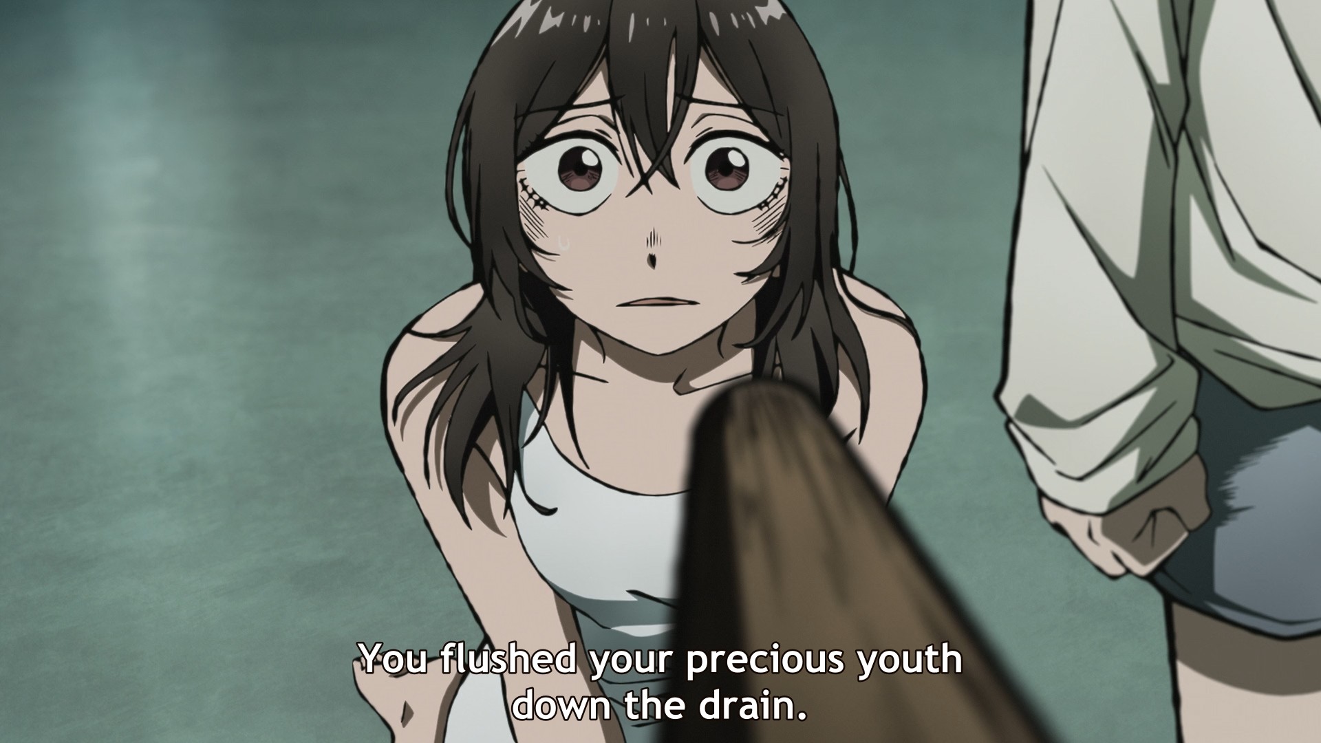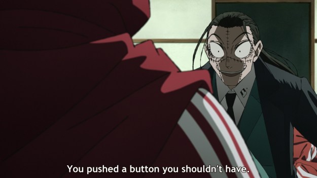 Luckily for Sanda, Oshibu’s eyes literally pop out of his eye sockets before he could take in the boy’s visage. A quick-thinking Amaya then buries Sanda under a mountain of red jackets. We then learn that Oshibu has Ship of Theseus himself into a cyborg. Yep, even his dick and balls are now fake. He even claims that one of his artificial eyes cost a hundred million yen. A hundred million. Bro, what? You’re so obsessed with being young that you’re barely even human anymore? How does that even make sense? Youthfulness is an aspect of humanity. It doesn’t freaking count if you’re a robot! Next, I’m so curious about the wealth disparity in this alternate, dystopian Japan. Obviously, Oshibu is one of those hypocritical fat cats sitting at the top of society, sucking up all the money and resources. But how does this all work? How does putting kids on a pedestal — but also turning them into mindless slaves — somehow translate to an even wider gap between the haves and the have-nots? But there’s an even more important topic to dwell on.