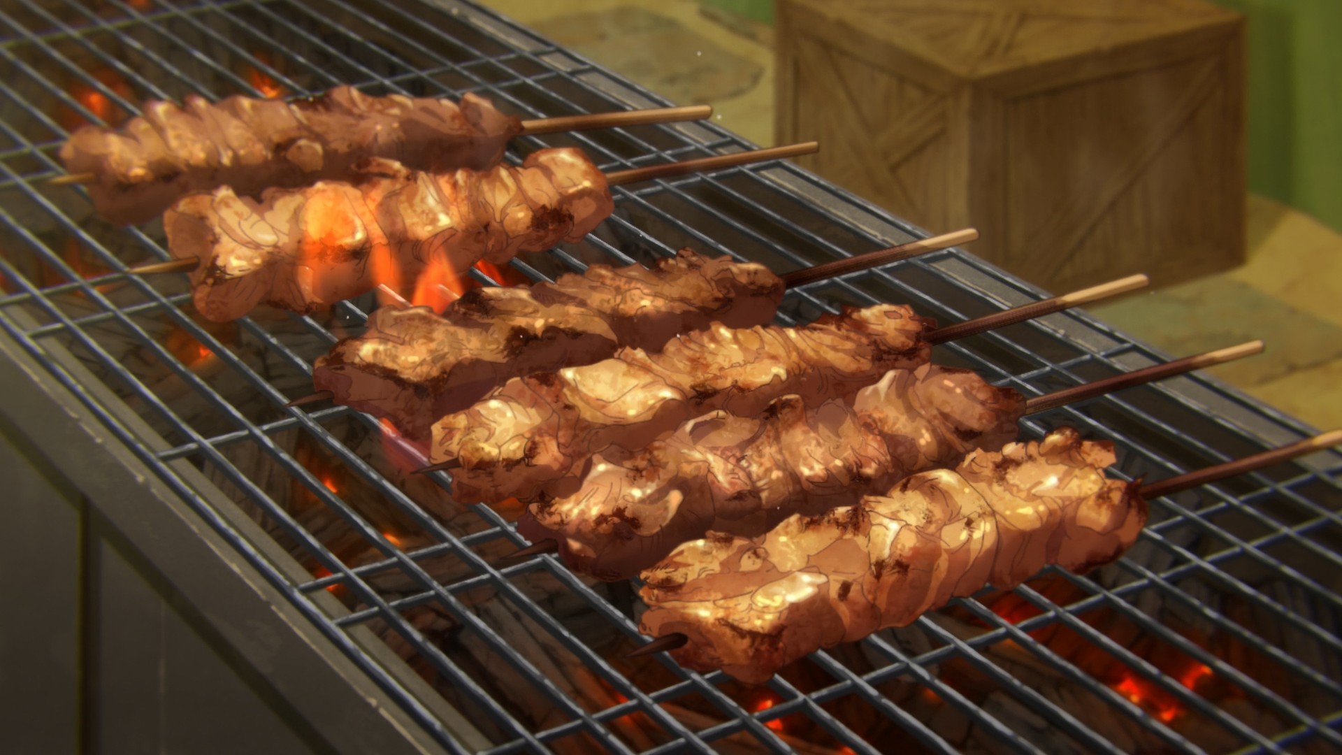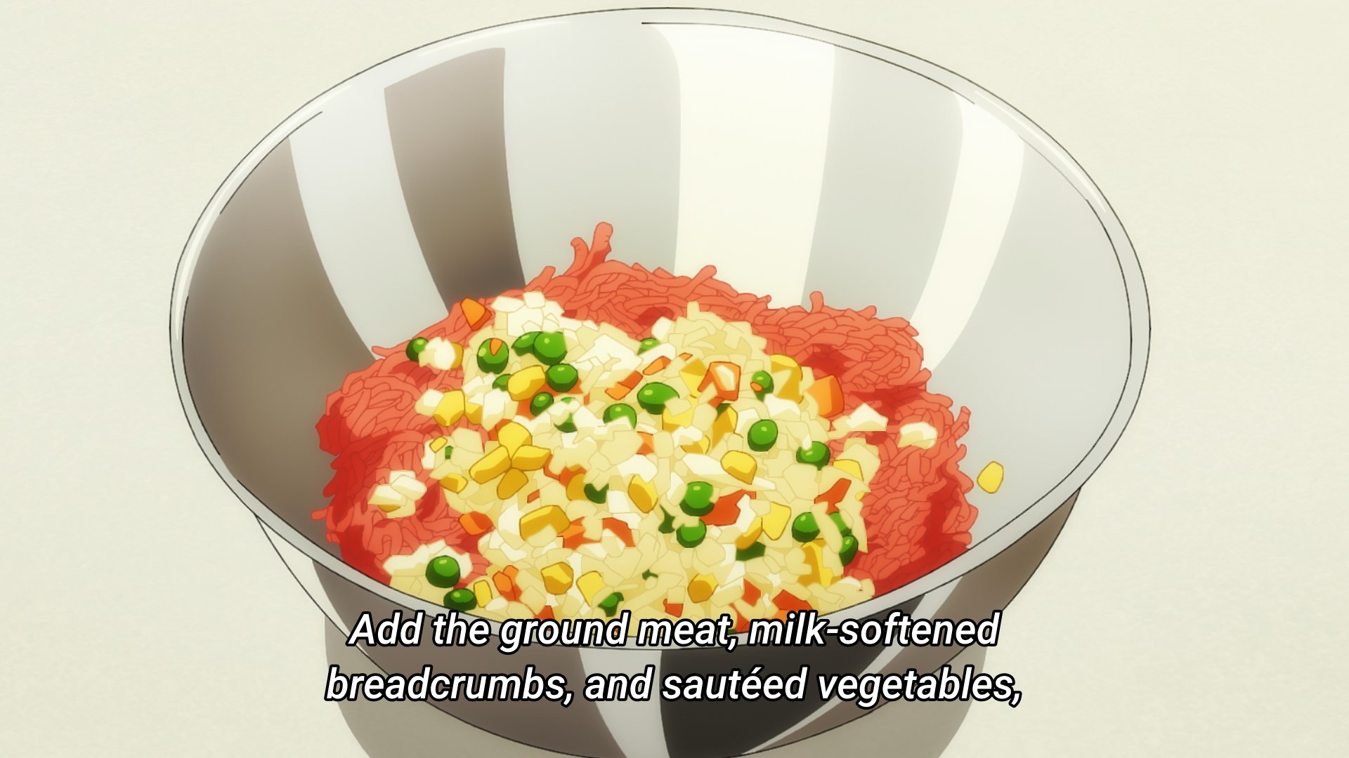 Anyways, time for the food. First, the gang eats a ton of meat skewers from a food stand. Eh, again, where are the veggies? I just think eating nothing but meat doesn’t let you actually appreciate it to its fullest. Too much of one thing will dull your tastebuds. I like to think veggies (and your drink of choice) wipe the palate clean so you can properly enjoy the next bite. Second, he makes meatloaf towards the end of the episodes. Onions, sure, but I would never put corn, peas and carrots inside the meatloaf. That’s too much. I’d rather have them on the side, untainted by all the meat juices. He then stuffs quail eggs in the loaves. Growing up, I used to eat these Asian meat buns that essentially had a big meatball on the inside. And that meatball would then have an egg in it as well. I guess this is the closest thing I’ve had to whatever Mukoda’s making? Anyway, I had to chuckle at the thought of making a rich red wine and butter jus from the drippings. That’s a very fancy way to dress up a meatloaf.